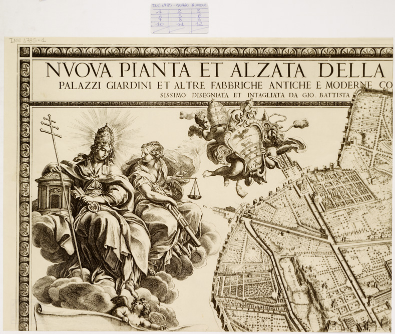 "CON TUTTE LE STRADE LE PIAZZE ET EDIFICII DE TEMPII PALAZZI GIARDINI ET ALTRE FABBRICHE ANTICHE E MODERNE COME SI TROVANO AL PRESENTE NEL PONTIFICATO DI N. S. PAPA INNOCENTIO XI. DISEGNIATA ET INTAGLIATA DA GIO. BATTISTA FALDA DA VALDUGGIA ET DATO AL PUBBLICO DA GIO. GIACOMO DE ROSSI DALLE SUE STAMPE IN ROMA ALLA PACE L' ANNO 1679. Riproduzione a cura della Biblioteca Vaticana (" Le Piante Maggiori di Roma dei secoli XVI e XVIII, riprodotte in fototipia a cura della Biblioteca Vaticana, in 12 fogli, tratta da l' originale pure in 12 fogli di cm.37x48. E' accompagnata da un testo illustrativo con ampie notizie su l' autore e il contenuto della pianta, le varie edizioni di essa, ecc., l' elenco dei nomi e la trascrizione delle leggende. La pianta è a proiezione verticale con elevazione. E' corredata da una cartina dell' agro romano e di vedute. "