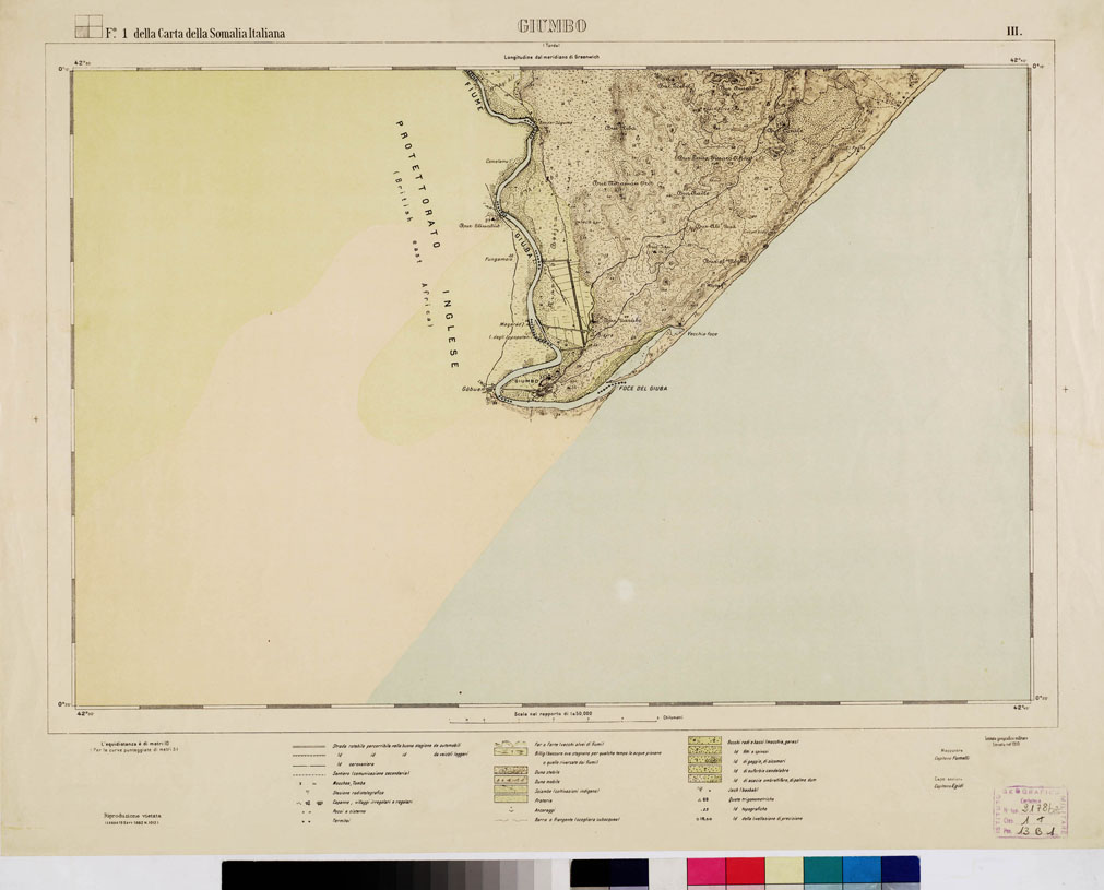 "(Fogli N. 1, 2, 4 della Carta della Somalia Italiana). I.G.M. Questa carta, insieme a quelle della regione di Brava-Soblalle-Avai, al 100 000 (ved. N°11 d'ordine) e della regione dell'Uebi-Scebeli presso Merca, al 1:50000 (v. N°10 d'ordine), rappresenta uno dei rilievi di precisione pubblicati dall'I.G.M. per la Somalia. I lavori topografici regolari furono iniziati nel 1910. Scartata la prima idea di adottare la scala di 1:100000 (perché la carta male avrebbe corrisposto agli scopi per i quali era costruita, volendosi con essa ottenere una guida per le delimitazioni delle concessioni, progetti stradali e di canalizzazione, ecc.), venne scelta la scala di 1:50000 e fu inoltre stabilito di eseguire le livellazioni geometriche. La proiezione impiegata fu la cilindrica equivalente di Lambert. Le levate topografiche, estese in un primo tempo a una superficie di circa 1000 kmq e suddivise in 5 tavolette di 10' di latitudine per 15' di longitudine, denominate rispettivamente Giumbo, Torda, Muriole, Margherita, e Vadda, furono continuate poi nel 1912 e 1913 nella zona settentrionale. Furono comprese così altre 4 tavolette denominate Cainsuma, Gelib sul Giuba, Aughele, Arenaga, sicché l'intera carta copre circa 1900 kmq rappresentati in 9 fogli. La stampa era a colori ma nel 1998 venne restaurata in nero. Le curve altimetriche sono tracciate all'equidistanza di 10 metri. Sono distinte le dune stabili, le dune mobili, le coltivazioni indigene (sciambe), le praterie e i diversi tipi di vegetazione. Per la viabilità si sono impiegati due segni, uno per le carovaniere l'altro per i sentieri. I nomi di luogo sono trascritti secondo la grafia italiana. La carta, pur limitata a una non vasta zona, costituisce un notevole contributo alla cartografia della Somalia."