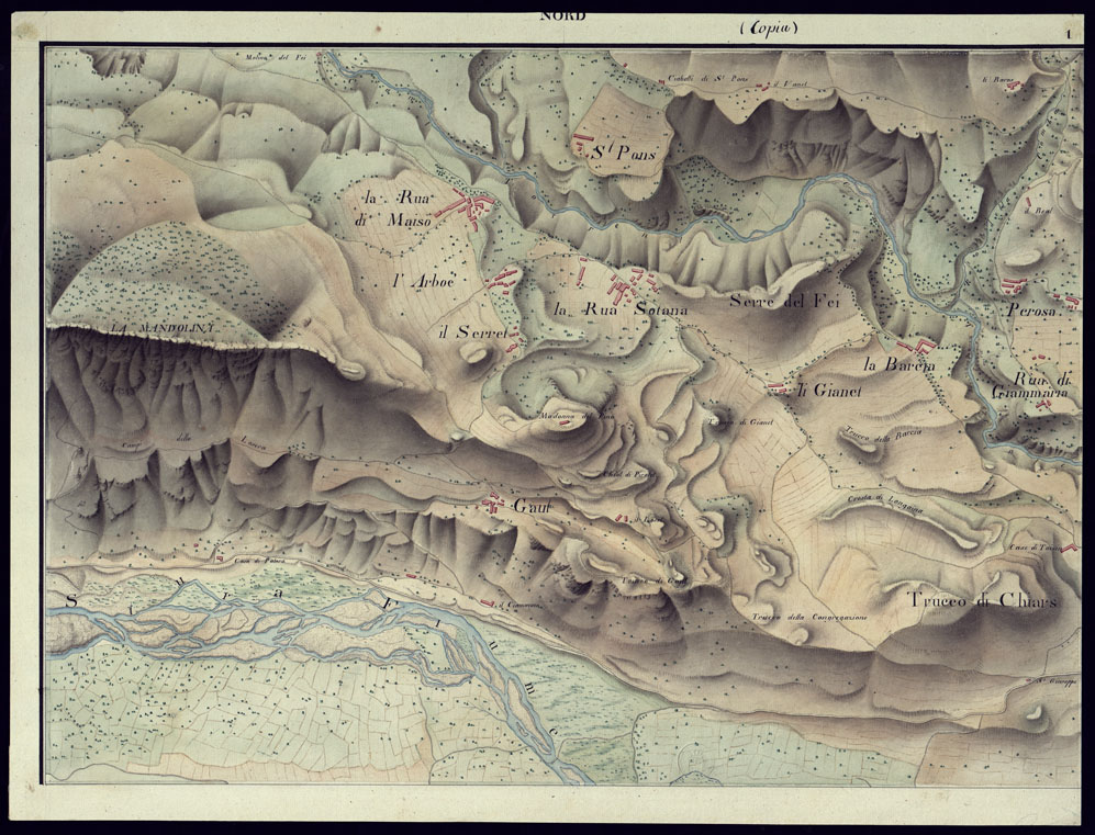 "Rilievo in quattro fogli, ad acquerello e due lucidi dei fogli n. 1 e n. 2. Questo esemplare non riporta data e firma ma è stato probabilmente eseguito dall'Ing. Rinaudo d'ordine del Magg. Gen. Barone di Monthoux. Orografia a sfumo, abitati in rosso, acque in azzurro, vegetazioni in verde. Scale in trabucchi e in metri. Al documento n. 130 altro esemplare in quattro fogli."