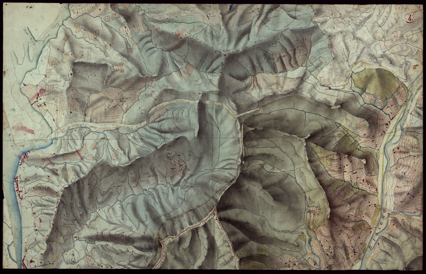 "Carta in 12 fogli con Indice e Quadro d'unione. Minute di rilevamenti eseguite dagli Ingegneri topografi, sotto gli ordini del Conte di Saluzzo Magg. di Stato Maggiore Generale come da nota firmata dall'Ing. Topografo Pellegrini. Orografia a sfumo a luce obliqua, acque in azzurro, abitati in rosso. Sono indicate le colture. Strade in nero. Annesso un foglio col titolo, le scale grafiche ed elenco numerico delle costruzioni principali di Genova. A questa carta si riallaccia anche il documento n. 267/9382."