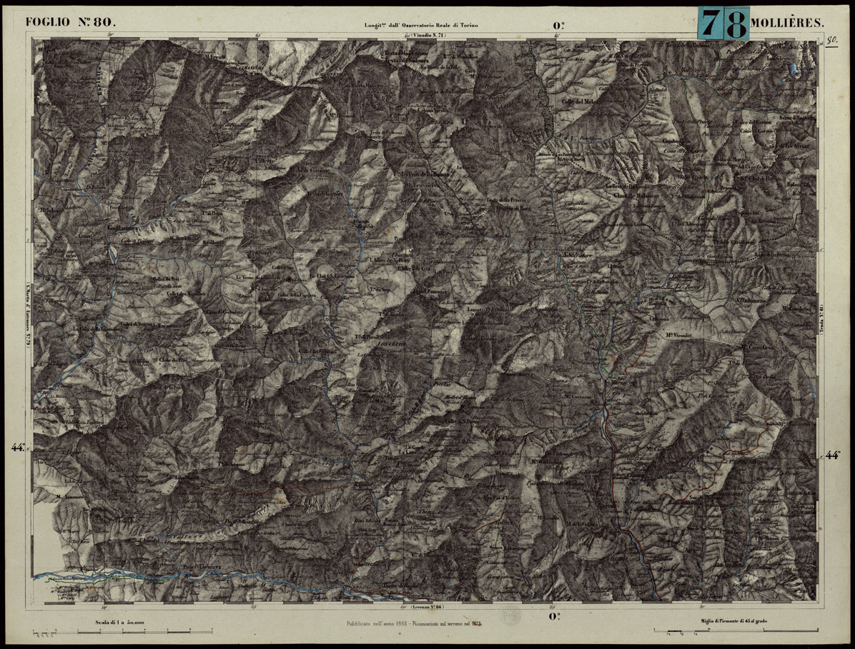 CARTA TOPOGRAFICA DEGLI STATI IN TERRAFERMA DI S.M. IL RE DI SARDEGNA ALLA SCALA DI 1.A 50.000. OPERA DEL CORPO REALE DELLO STATO MAGGIORE - FOGLIO N.°80. - MOLLIERES + DOCUMENTO DI AGGIORNAMENTO UNICO
