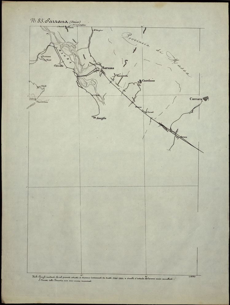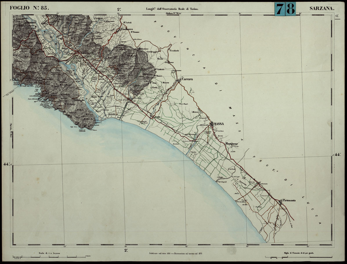CARTA TOPOGRAFICA DEGLI STATI IN TERRAFERMA DI S.M. IL RE DI SARDEGNA ALLA SCALA DI 1.A 50.000. OPERA DEL CORPO REALE DELLO STATO MAGGIORE - FOGLIO N.°85. SARZANA + DOCUMENTO DI AGGIORNAMENTO UNICO
