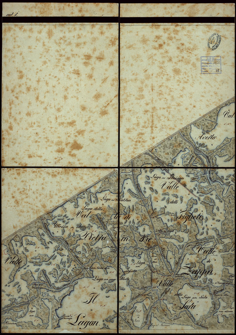 "Piano della città marittima e fortezza di Venezia colle sue lagune e colla terra ferma che le circonda, dalla foce dell'Adige a quella del Piave. Copia della carta del Denaix eseguita dal 1800 al 1808 alla scala di 1:18.000 in trenta fogli. Il disegno fu eseguito nel 1836 la riduzione nel 1837 a spesa del Genio terrestre austriaco. Consta di trenta fogli ad acquarello montati su tela. Colori usati: azzurro per l'idrografia, rosso per gli abitati e le strade principali, verde per le coltivazioni. Il foglio 1 contiene il quadro di unione. I fogli 9 e 10 recano il titolo il foglio 20 contiene notizie sulla costruzione della carta: il foglio 25 la rosa dei venti il foglio 30 notizie sulla laguna. Annessi alla carta sono un piano del Forte di S.Pietro pure ad acquarello alla scala di 1:2.500 e una carta dei "sondaggi lungo la costa tra il Forte Alberone e la Batteria Quattro Fontane" firmata "Salis Soglio maggio 1847"."
