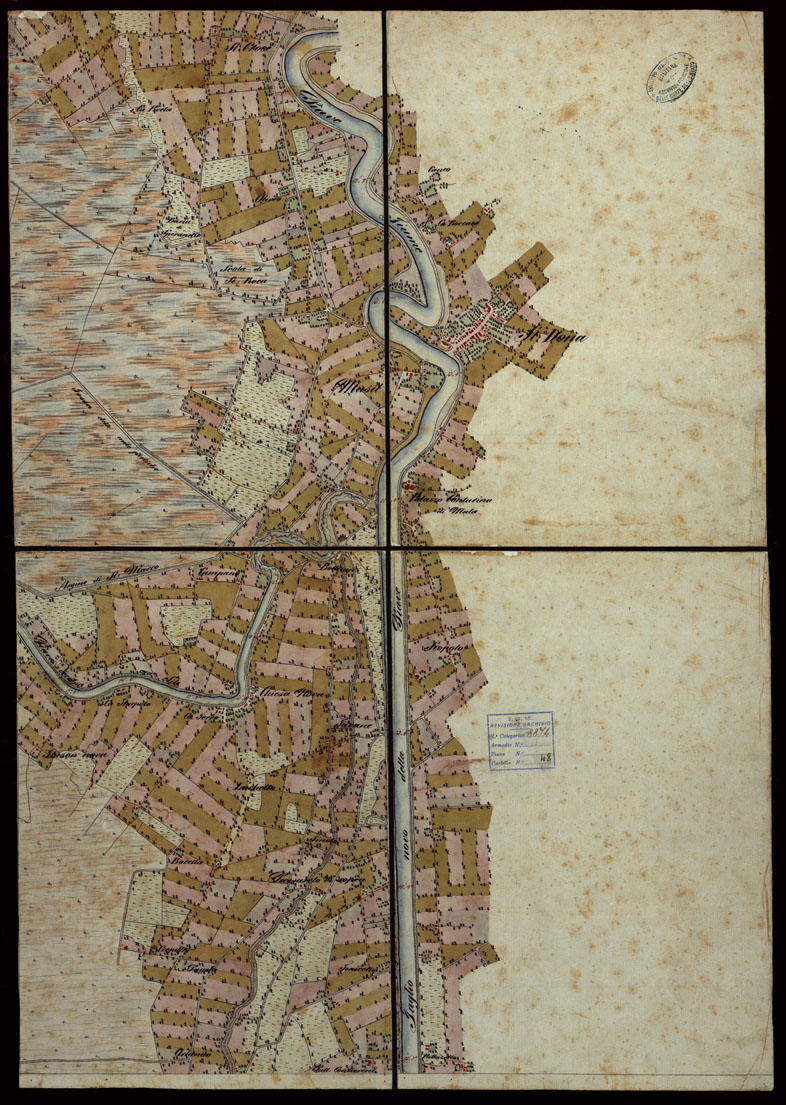 "Piano della città marittima e fortezza di Venezia colle sue lagune e colla terra ferma che le circonda, dalla foce dell'Adige a quella del Piave. Copia della carta del Denaix eseguita dal 1800 al 1808 alla scala di 1:18.000 in trenta fogli. Il disegno fu eseguito nel 1836 la riduzione nel 1837 a spesa del Genio terrestre austriaco. Consta di trenta fogli ad acquarello montati su tela. Colori usati: azzurro per l'idrografia, rosso per gli abitati e le strade principali, verde per le coltivazioni. Il foglio 1 contiene il quadro di unione. I fogli 9 e 10 recano il titolo il foglio 20 contiene notizie sulla costruzione della carta: il foglio 25 la rosa dei venti il foglio 30 notizie sulla laguna. Annessi alla carta sono un piano del Forte di S.Pietro pure ad acquarello alla scala di 1:2.500 e una carta dei "sondaggi lungo la costa tra il Forte Alberone e la Batteria Quattro Fontane" firmata "Salis Soglio maggio 1847"."