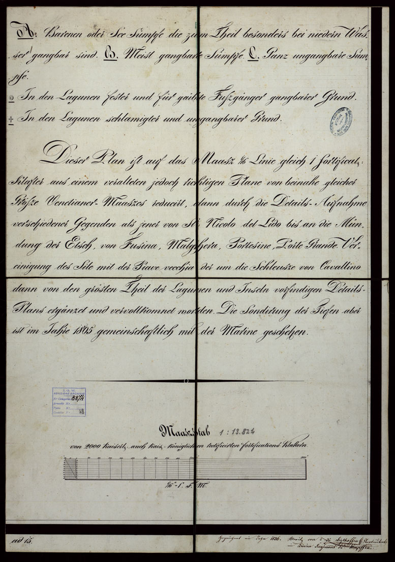 "Piano della città marittima e fortezza di Venezia colle sue lagune e colla terra ferma che le circonda, dalla foce dell'Adige a quella del Piave. Copia della carta del Denaix eseguita dal 1800 al 1808 alla scala di 1:18.000 in trenta fogli. Il disegno fu eseguito nel 1836 la riduzione nel 1837 a spesa del Genio terrestre austriaco. Consta di trenta fogli ad acquarello montati su tela. Colori usati: azzurro per l'idrografia, rosso per gli abitati e le strade principali, verde per le coltivazioni. Il foglio 1 contiene il quadro di unione. I fogli 9 e 10 recano il titolo il foglio 20 contiene notizie sulla costruzione della carta: il foglio 25 la rosa dei venti il foglio 30 notizie sulla laguna. Annessi alla carta sono un piano del Forte di S.Pietro pure ad acquarello alla scala di 1:2.500 e una carta dei "sondaggi lungo la costa tra il Forte Alberone e la Batteria Quattro Fontane" firmata "Salis Soglio maggio 1847"."