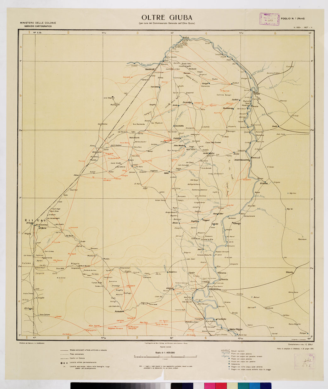 "Ministero delle Colonie. Servizio Cartografico. Carta dimostrativa costruita e disegnata personalmente da S. E. Corrado Zoli. Essa costituisce un interessante documento di consultazione. Consta di tre fogli dei quali il N° I (nord) misura metri 0,60 x 0,62, il N° 2 (centrale) metri 0,57 x 0,65, il N° 3 (sud) m. 0,49 x 0,60. La carta rappresenta il territorio compreso tra il 1° 30' parallelo sud e il 4° parallelo nord e tra il 41° meridiano e il 43°. La rappresentazione è limitata alla sola planimetria il terreno è a fondo unito giallino con tracciata in azzurro la rete idrografica, e in nero quella stradale (strade camionabili a fondo artificiale o naturale, piste carovaniere), i confini, i centri abitati. I particolari desunti da carte preesistenti o da informazioni non verificate sono tracciati in rosso. I fogli sono piegati e contenuti in busta accompagnati da un repertorio dei nomi inseriti nella carta. "