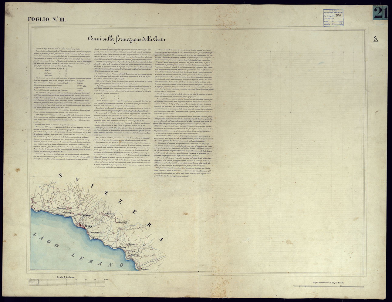 CARTA TOPOGRAFICA DEGLI STATI IN TERRAFERMA DI S.M. IL RE DI SARDEGNA ALLA SCALA DI 1 A 50.000 OPERA DEL CORPO REALE DELLO STATO MAGGIORE - FOGLIO N°III + CENNI SULLA FORMAZIONE DELLA CARTA
