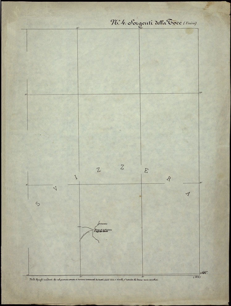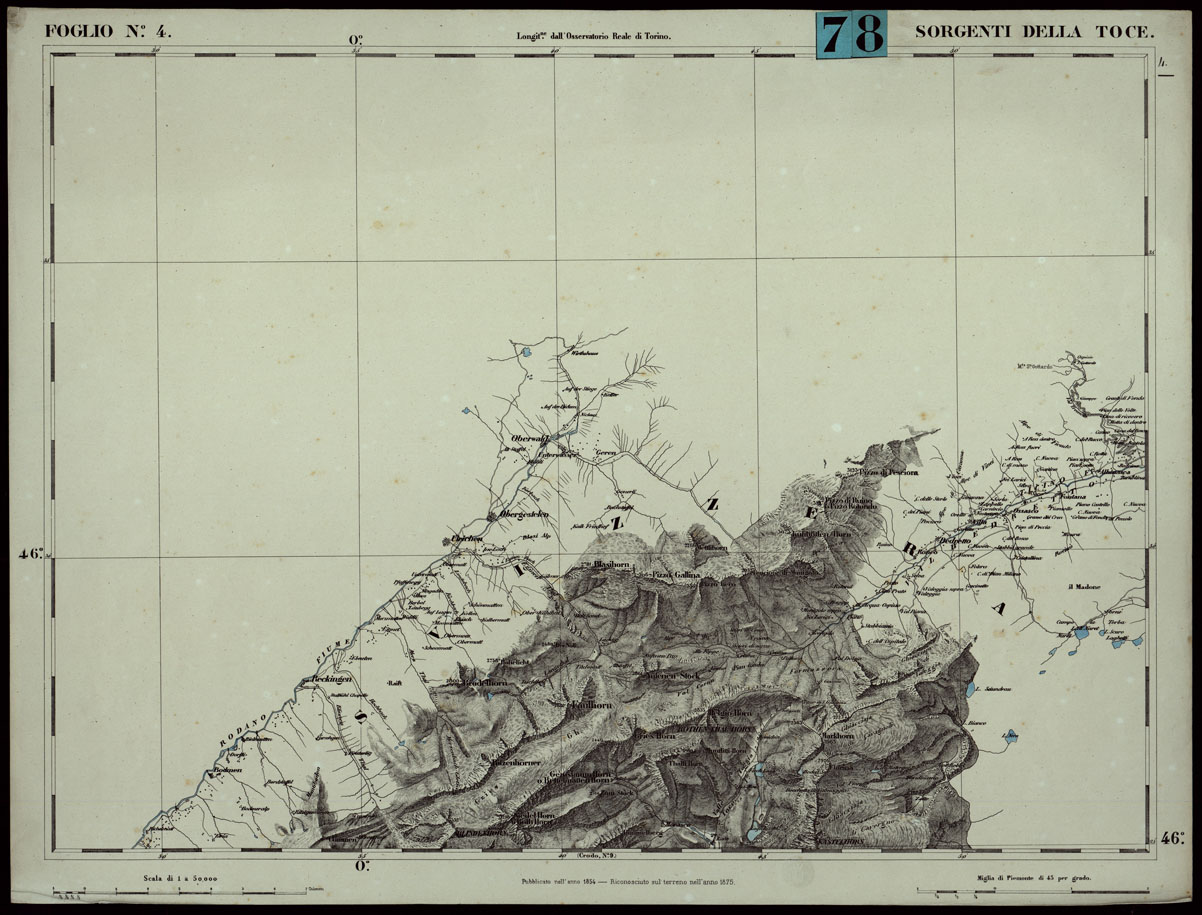 CARTA TOPOGRAFICA DEGLI STATI IN TERRAFERMA DI S.M. IL RE DI SARDEGNA ALLA SCALA DI 1.A 50.000. OPERA DEL CORPO REALE DELLO STATO MAGGIORE - FOGLIO N.°4. SORGENTI DELLA TOCE + DOCUMENTO DI AGGIORNAMENTO