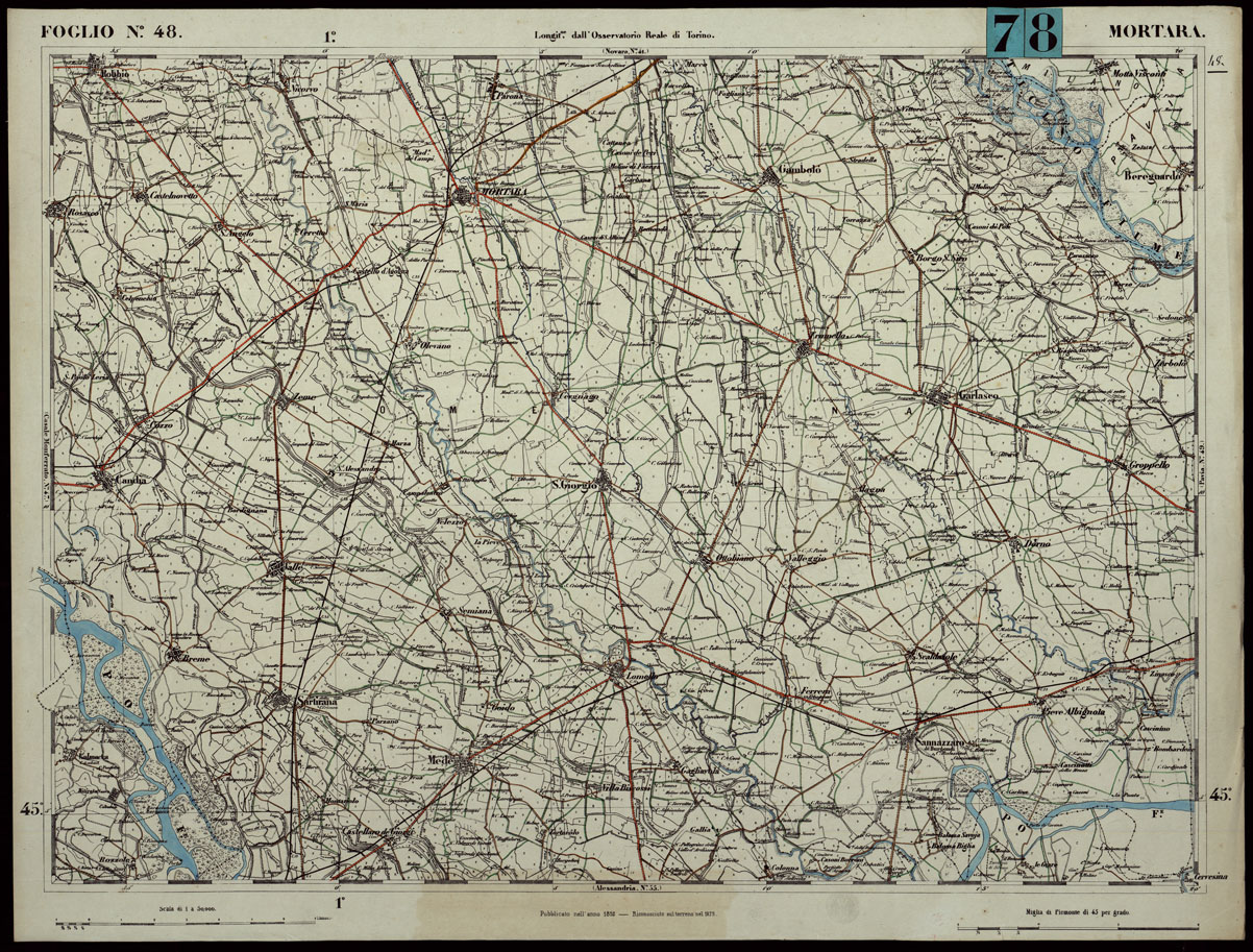 CARTA TOPOGRAFICA DEGLI STATI IN TERRAFERMA DI S.M. IL RE DI SARDEGNA ALLA SCALA DI 1.A 50.000. OPERA DEL CORPO REALE DELLO STATO MAGGIORE - FOGLIO N.°48 MORTARA + DOCUMENTO DI AGGIORNAMENTO PARTE OCCIDENTALE E ORIENTALE