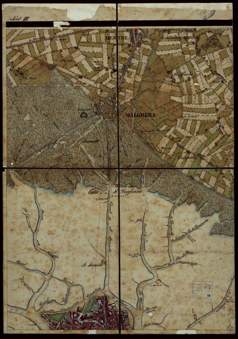 "Piano della città marittima e fortezza di Venezia colle sue lagune e colla terra ferma che le circonda, dalla foce dell'Adige a quella del Piave. Copia della carta del Denaix eseguita dal 1800 al 1808 alla scala di 1:18.000 in trenta fogli. Il disegno fu eseguito nel 1836 la riduzione nel 1837 a spesa del Genio terrestre austriaco. Consta di trenta fogli ad acquarello montati su tela. Colori usati: azzurro per l'idrografia, rosso per gli abitati e le strade principali, verde per le coltivazioni. Il foglio 1 contiene il quadro di unione. I fogli 9 e 10 recano il titolo il foglio 20 contiene notizie sulla costruzione della carta: il foglio 25 la rosa dei venti il foglio 30 notizie sulla laguna. Annessi alla carta sono un piano del Forte di S.Pietro pure ad acquarello alla scala di 1:2.500 e una carta dei "sondaggi lungo la costa tra il Forte Alberone e la Batteria Quattro Fontane" firmata "Salis Soglio maggio 1847"."