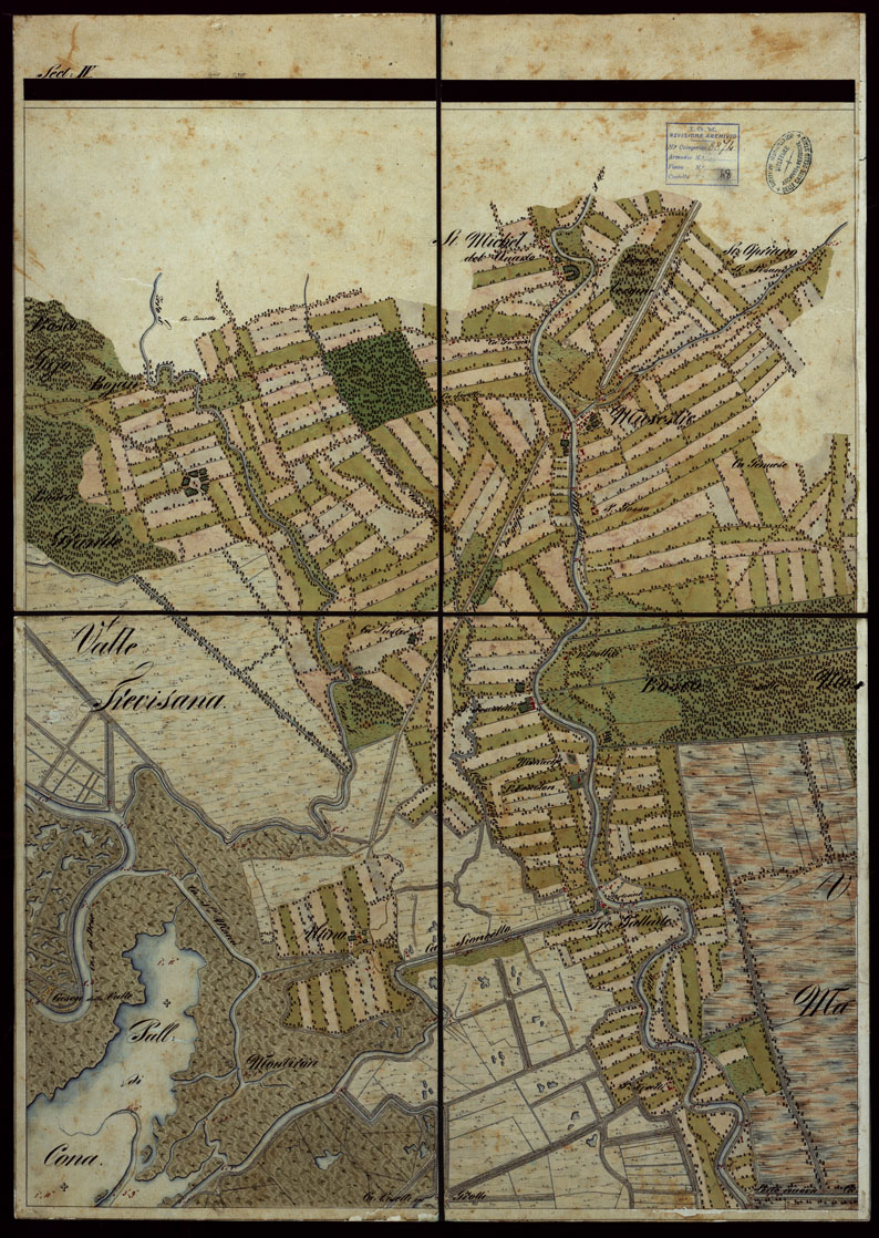 "Piano della città marittima e fortezza di Venezia colle sue lagune e colla terra ferma che le circonda, dalla foce dell'Adige a quella del Piave. Copia della carta del Denaix eseguita dal 1800 al 1808 alla scala di 1:18.000 in trenta fogli. Il disegno fu eseguito nel 1836 la riduzione nel 1837 a spesa del Genio terrestre austriaco. Consta di trenta fogli ad acquarello montati su tela. Colori usati: azzurro per l'idrografia, rosso per gli abitati e le strade principali, verde per le coltivazioni. Il foglio 1 contiene il quadro di unione. I fogli 9 e 10 recano il titolo il foglio 20 contiene notizie sulla costruzione della carta: il foglio 25 la rosa dei venti il foglio 30 notizie sulla laguna. Annessi alla carta sono un piano del Forte di S.Pietro pure ad acquarello alla scala di 1:2.500 e una carta dei "sondaggi lungo la costa tra il Forte Alberone e la Batteria Quattro Fontane" firmata "Salis Soglio maggio 1847"."