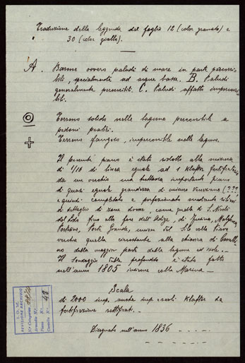 "Piano della città marittima e fortezza di Venezia colle sue lagune e colla terra ferma che le circonda, dalla foce dell'adige e quella del Piave. Copia della carta del Denaix eseguita dal 1800 al 1808 alla scala di 1:18.000 in trenta fogli. Il disegno fu eseguito nel 1836 la riduzione nel 1837 a spesa del Genio terrestre austriaco. Consta di trenta fogli ad acquerello montati su tela. Colori usati : azzurro per l'idrografia, rosso per gli abitati e le strade principali, verde per le coltivazioni. Il foglio 1 contiene il quadro di unione. I fogli 9 e 10 recano il titolo il foglio 20 contiene notizie sulla costruzione della carta: il foglio 25 la rosa dei venti il foglio 30 notizie sulla luguna. Annessi alla carta sono un piano del Forte di S.Pietro pure ad acquerello alla scala di 1:2.500 e una carta dei "sondaggi lungo la costa tra il Forte Alberone e la Batteria Quattro Fontane" firmata "Salis Soglio maggio 1847". "