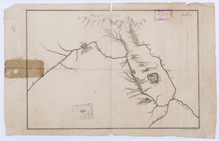 "Incisione di AB. Gio. Canocchi. Foglio unico recante in alto a destra l'indicazione "A. Tavola 1".Sembra la copia di una delle tavole annesse alle "Memorie idraulico-storiche" di Vittorio Fossombroni, pubblicate nel 1789. Carta analoga a quella di cui al n. 3862 d´inventario (" Carta del corso della Chiana da Torrita alla confluenza colla Paglia ")."