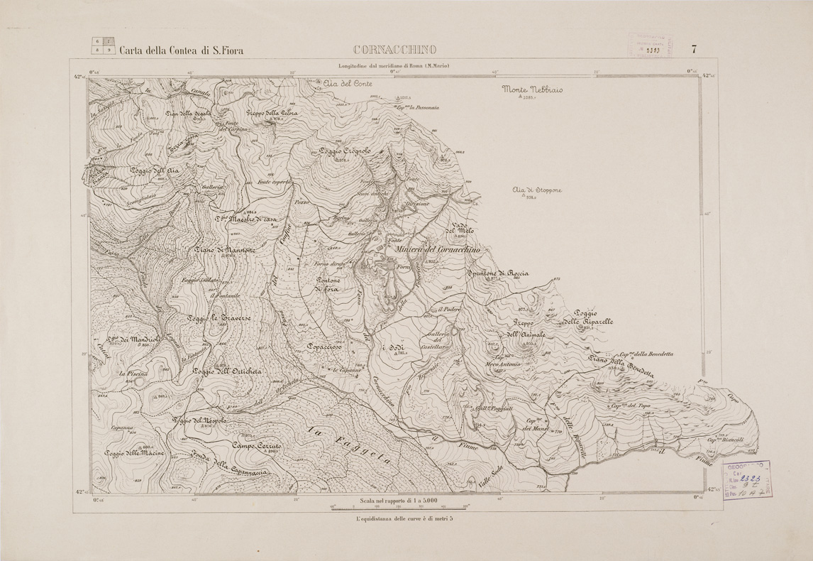 "Carta in 10 fogli stampati in nero con orografia dimostrata a mezzo di curve di livello tracciate alla equidistanza di 5 m. e curve punteggiate alla equidistanza di 1 m. La carta distingue abitati, strade (rotabili, comunali, private, non sempre praticabili, campestri, mulattiere, sentieri) acquedotti, siepi, muri, gallerie, linee d'impluvio, capisaldi, ecc. Annesso il foglio titolo con quadro d'unione, la leggenda dei segni convenzionali e la firma "Angelo Marini topografo, Firenze, dicembre 1918". Confronta anche al numero d' inventario 2323 bis " Santa Fiora IIINE " - scala 1:25.000 - edizione del 1885."