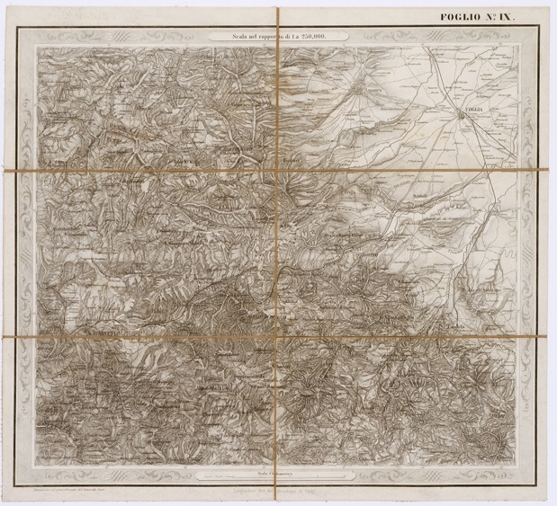 "...FOGLI 25 FOTOINCISA COL PROCEDIMENTO DEL GENERALE AVET ALLA SCALA DI 1:250.000 PUBBLICATA DALL'ISTITUTO TOPOGRAFICO MILITARE, 1874. Bella, pregevolissima carta. E' in 25 fogli oltre il foglio titolo. Su di questo sono dati i seguenti "Cenni sulla costruzione della Carta": "Questa carta corografica è tratta da una topografica disegnata a mano alla scala di 1:103.680, che si trovava negli archivi dell'ex-Ufficio Topografico di Napoli e che era dovuta allo Stato Maggiore Austriaco. Essa fu eseguita durante l'occupazione di quel Regno dal 1821 al 1824, e ne fu fondamento la nota carta del Rizzi-Zannoni, di cui la Carta Austriaca è per così dire una trasformazione. Difatti la planimetria fu poco o punto modificata ma si dette maggior rilievo all'orografia, sostituendo, previe ricognizioni sul terreno, il metodo del tratteggio a luce zenitale, a quello della prospettiva cavaliera col quale sono rappesentate le alture nelle Carte del Zannoni. Non è certamente, nè può essere un lavoro di grande esattezza geometrica, come quello che non dipende da rilievi regolari e molto meno da coordinazione di questi ad una rete di punti geodetici. Nonostante il Comitato dello Stato Maggiore credè di rendere un servizio alle varie Amministrazioni dello Stato ed al pubblico, deliberando, sin dall'anno 1868, di utilizzarla (in via transitoria e intanto che si compivano i rilievi regolari nelle provincie meridionali) con lo scopo di somministrare una guida sufficiente al militare, al geografo ed al viaggiatore. La carta fu riconosciuta sul terreno negli anni 1868-1869 onde completarvi il sistema delle strade ruotabili a fondo manufatto. Di poi si operò il disegno dei vari fogli alla scala 1:250.000, che fu adottata per la pubblicazione. Così ridotta essa consta di 25 fogli. La riproduzione ne fu eseguita con il sistema di fotoincisione del Maggior Generale Conte Avet". (vedi: N. 39 d'Ordine, Cart. d'Arch. N° 71 - Docum. N° 9021 - Files A0001415-1491, e N. 61 d' Ordine, Cart. d 'Arch. N° 72 Docum. N° 9022 - Files A0001537-1594). Alla carta è unito un quadro di unione. Due copie, una delle quali incompleta e l'altra, completa, riveduta dal 1882-1884. La carta completa si trova in biblioteca è montata su tela a stacchi n. di inventario generale 50, schedario carte generali Italia. In archivio (Cart. d'Arch. N. 90 - Docum. n. 26 - Files A0002825-2844) si trova la copia parziale delle carte (mancano i seguenti fogli: 9, 13, 15, 16, 17, 20, 25) non è montata su tela."
