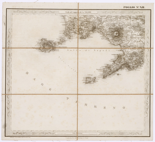 "...FOGLI 25 FOTOINCISA COL PROCEDIMENTO DEL GENERALE AVET ALLA SCALA DI 1:250.000 PUBBLICATA DALL'ISTITUTO TOPOGRAFICO MILITARE, 1874. Bella, pregevolissima carta. E' in 25 fogli oltre il foglio titolo. Su di questo sono dati i seguenti "Cenni sulla costruzione della Carta": "Questa carta corografica è tratta da una topografica disegnata a mano alla scala di 1:103.680, che si trovava negli archivi dell'ex-Ufficio Topografico di Napoli e che era dovuta allo Stato Maggiore Austriaco. Essa fu eseguita durante l'occupazione di quel Regno dal 1821 al 1824, e ne fu fondamento la nota carta del Rizzi-Zannoni, di cui la Carta Austriaca è per così dire una trasformazione. Difatti la planimetria fu poco o punto modificata ma si dette maggior rilievo all'orografia, sostituendo, previe ricognizioni sul terreno, il metodo del tratteggio a luce zenitale, a quello della prospettiva cavaliera col quale sono rappesentate le alture nelle Carte del Zannoni. Non è certamente, nè può essere un lavoro di grande esattezza geometrica, come quello che non dipende da rilievi regolari e molto meno da coordinazione di questi ad una rete di punti geodetici. Nonostante il Comitato dello Stato Maggiore credè di rendere un servizio alle varie Amministrazioni dello Stato ed al pubblico, deliberando, sin dall'anno 1868, di utilizzarla (in via transitoria e intanto che si compivano i rilievi regolari nelle provincie meridionali) con lo scopo di somministrare una guida sufficiente al militare, al geografo ed al viaggiatore. La carta fu riconosciuta sul terreno negli anni 1868-1869 onde completarvi il sistema delle strade ruotabili a fondo manufatto. Di poi si operò il disegno dei vari fogli alla scala 1:250.000, che fu adottata per la pubblicazione. Così ridotta essa consta di 25 fogli. La riproduzione ne fu eseguita con il sistema di fotoincisione del Maggior Generale Conte Avet". (vedi: N. 39 d'Ordine, Cart. d'Arch. N° 71 - Docum. N° 9021 - Files A0001415-1491, e N. 61 d' Ordine, Cart. d 'Arch. N° 72 Docum. N° 9022 - Files A0001537-1594). Alla carta è unito un quadro di unione. Due copie, una delle quali incompleta e l'altra, completa, riveduta dal 1882-1884. La carta completa si trova in biblioteca è montata su tela a stacchi n. di inventario generale 50, schedario carte generali Italia. In archivio (Cart. d'Arch. N. 90 - Docum. n. 26 - Files A0002825-2844) si trova la copia parziale delle carte (mancano i seguenti fogli: 9, 13, 15, 16, 17, 20, 25) non è montata su tela."