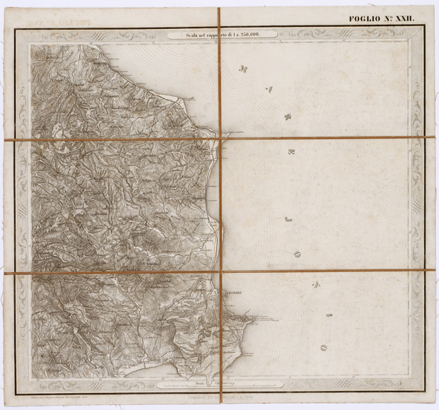 "...FOGLI 25 FOTOINCISA COL PROCEDIMENTO DEL GENERALE AVET ALLA SCALA DI 1:250.000 PUBBLICATA DALL'ISTITUTO TOPOGRAFICO MILITARE, 1874. Bella, pregevolissima carta. E' in 25 fogli oltre il foglio titolo. Su di questo sono dati i seguenti "Cenni sulla costruzione della Carta": "Questa carta corografica è tratta da una topografica disegnata a mano alla scala di 1:103.680, che si trovava negli archivi dell'ex-Ufficio Topografico di Napoli e che era dovuta allo Stato Maggiore Austriaco. Essa fu eseguita durante l'occupazione di quel Regno dal 1821 al 1824, e ne fu fondamento la nota carta del Rizzi-Zannoni, di cui la Carta Austriaca è per così dire una trasformazione. Difatti la planimetria fu poco o punto modificata ma si dette maggior rilievo all'orografia, sostituendo, previe ricognizioni sul terreno, il metodo del tratteggio a luce zenitale, a quello della prospettiva cavaliera col quale sono rappesentate le alture nelle Carte del Zannoni. Non è certamente, nè può essere un lavoro di grande esattezza geometrica, come quello che non dipende da rilievi regolari e molto meno da coordinazione di questi ad una rete di punti geodetici. Nonostante il Comitato dello Stato Maggiore credè di rendere un servizio alle varie Amministrazioni dello Stato ed al pubblico, deliberando, sin dall'anno 1868, di utilizzarla (in via transitoria e intanto che si compivano i rilievi regolari nelle provincie meridionali) con lo scopo di somministrare una guida sufficiente al militare, al geografo ed al viaggiatore. La carta fu riconosciuta sul terreno negli anni 1868-1869 onde completarvi il sistema delle strade ruotabili a fondo manufatto. Di poi si operò il disegno dei vari fogli alla scala 1:250.000, che fu adottata per la pubblicazione. Così ridotta essa consta di 25 fogli. La riproduzione ne fu eseguita con il sistema di fotoincisione del Maggior Generale Conte Avet". (vedi: N. 39 d'Ordine, Cart. d'Arch. N° 71 - Docum. N° 9021 - Files A0001415-1491, e N. 61 d' Ordine, Cart. d 'Arch. N° 72 Docum. N° 9022 - Files A0001537-1594). Alla carta è unito un quadro di unione. Due copie, una delle quali incompleta e l'altra, completa, riveduta dal 1882-1884. La carta completa si trova in biblioteca è montata su tela a stacchi n. di inventario generale 50, schedario carte generali Italia. In archivio (Cart. d'Arch. N. 90 - Docum. n. 26 - Files A0002825-2844) si trova la copia parziale delle carte (mancano i seguenti fogli: 9, 13, 15, 16, 17, 20, 25) non è montata su tela."