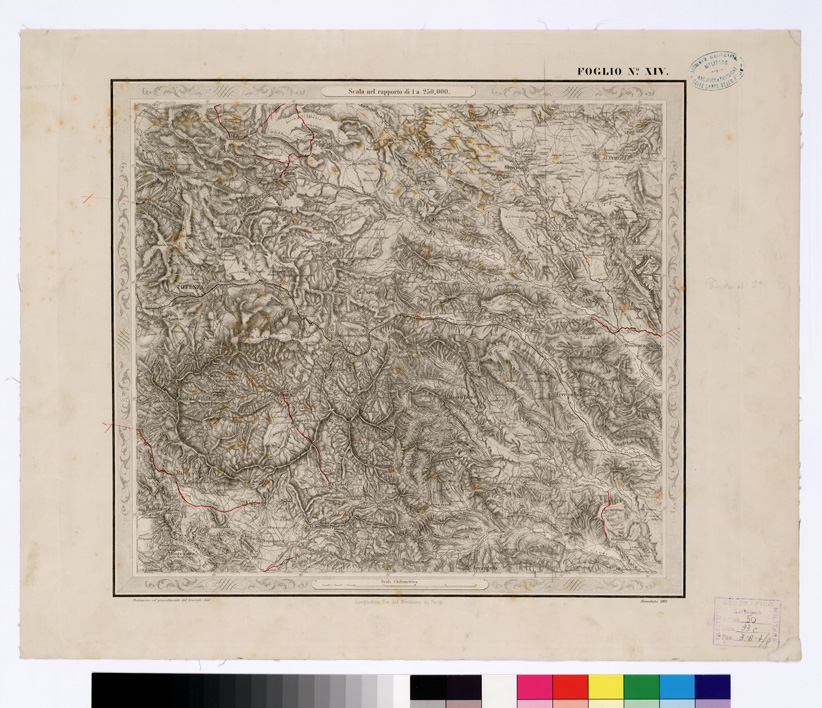 "...IN FOGLI 25 FOTOINCISA COL PROCEDIMENTO DEL GENERALE AVET ALLA SCALA DI 1:250.000 PUBBLICATA DALL'ISTITUTO TOPOGRAFICO MILITARE, 1874. Bella, pregevolissima carta. E' in 25 fogli oltre il foglio titolo. Su di questo sono dati i seguenti " Cenni sulla costruzione della Carta " : "Questa carta corografica è tratta da una topografica disegnata a mano alla scala di 1: 103.680, che si trovava negli Archivi dell ' ex- Ufficio Topografico di Napoli e che era dovuta allo Stato Maggiore Austriaco. Essa fu eseguita durante l ' occupazione di quel Regno dal 1821 al 1824, e ne fu fondamento la nota carta del Rizzi-Zannoni, di cui la Carta Austriaca è per così dire una trasformazione. Difatti la planimetria fu poco o punto modificata ma si dette un maggior rilievo all ' orografia, sostituendo, previe ricognizioni sul terreno, il metodo del tratteggio a luce zenitale, a quello della prospettiva cavaliera col quale sono rappresentate le alture nelle Carte del Zannoni. Non è certamente, né può essere un lavoro di grande esattezza geometrica, come quello che non dipende da rilievi regolari e molto meno da coordinazione di questi ad una rete di punti geodetici. Nonostante il Comitato dello Stato Maggiore credè di rendere un servizio alle varie Amministrazioni dello Stato ed al pubblico, deliberando, sin dall ' anno 1868, di utilizzarla (in via transitoria e intanto che si compivano i rilievi regolari nelle provincie meridionali) con lo scopo di somministrare una guida sufficiente al militare, al geografo ed al viaggiatore. La carta fu riconosciuta sul terreno negli anni 1868-1869 onde completarvi il sistema delle strade rotabili a fondo manufatto. Di poi si operò il disegno dei vari fogli alla scala di 1: 250.000, che fu adottata per la pubblicazione. Così ridotta essa consta di 25 fogli. La riproduzione ne fu eseguita con il sistema di fotoincisione del Maggior Generale Conte Avet ". (vedi: N. 39 d'Ordine, Cart. d'Arch. N° 71 - Docum. N° 9021 - Files A0001415-1491, e N. 61 d' Ordine, Cart. d 'Arch. N° 72 Docum. N° 9022 - Files A0001537-1594). Alla carta è unito un quadro di unione. Due copie, una delle quali incompleta e l'altra, completa, riveduta dal 1882-1884. La carta completa si trova in biblioteca è montata su tela a stacchi n. di inventario generale 50, schedario carte generali Italia. In archivio (Cart. d'Arch. N. 90 - Docum. n. 26 - Files A0002825-2844) si trova la copia parziale delle carte (mancano i seguenti fogli: 9, 13, 15, 16, 17, 20, 25) non è montata su tela."
