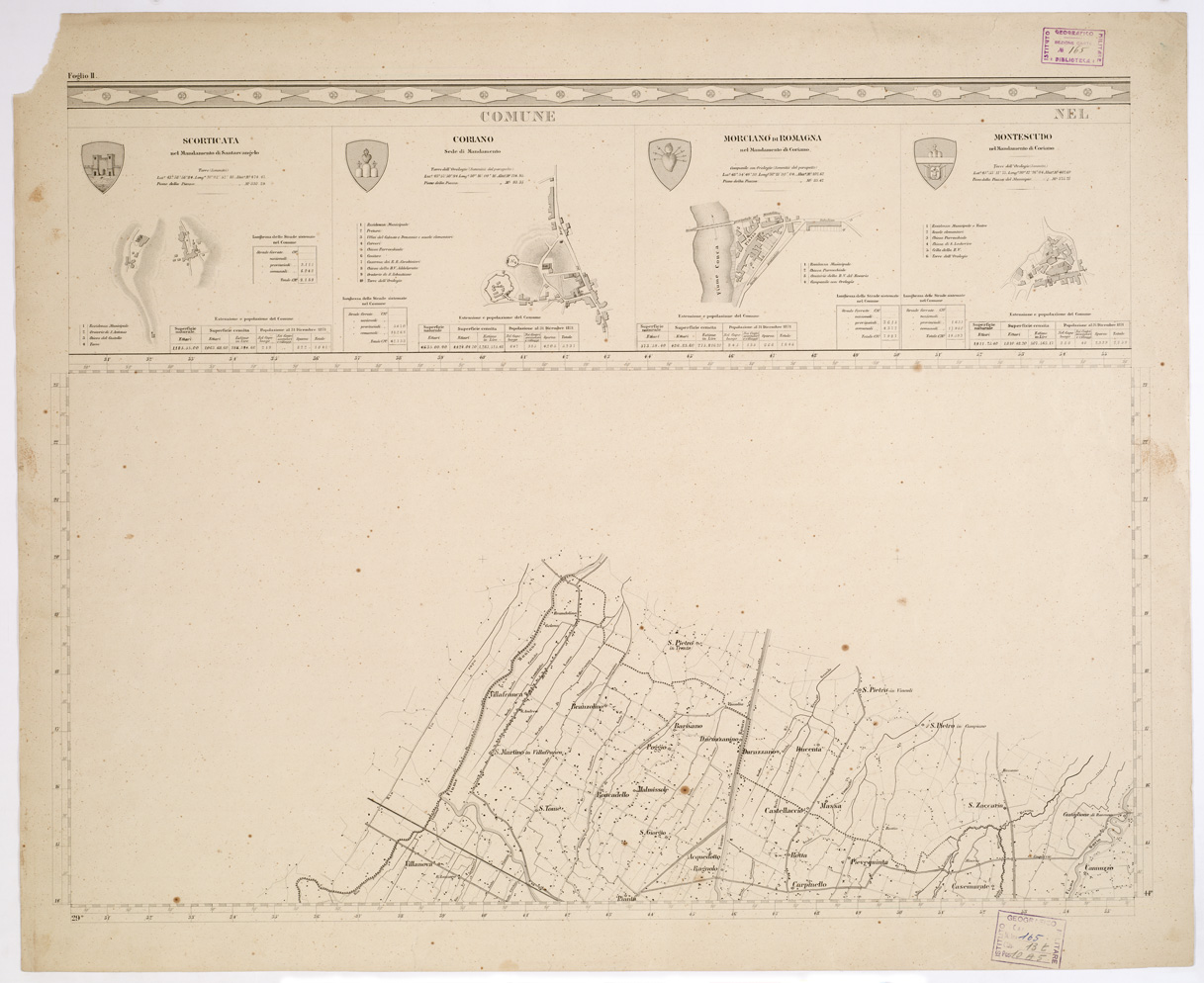 "...COL TERRITORIO DELLA REPUBBLICA DI S. MARINO E CON PARTE DI QUELLO DELLE FINITIME PROVINCIE DI FIRENZE, AREZZO, PESARO E RAVENNA. TESSUTA SOPRA UNA NUOVA RETE TRIGONOMETRICA COL MATERIALE DELLE MAPPE CATASTALI AGGIORNATE E RIDOTTE ALLA PROPORZIONE DI 1:50.000 SOTTO LA DIREZIONE DI UNA COMMISSIONE COMPOSTA DELL'INGEGNERE DAVIDE ANGELI, GIOVANNI MERLONI, FRANCESCO ANGELI E PUBBLICATA A SPESE DELLA PROVINCIA. NELL'ANNO 1888. STAB. LIT. THUMB, BOLOGNA. Carta in 16 fogli oltre un quadro d'unione. Venne costruita sulla base di una rete trigonometrica appositamente stesa. Proiezione adottata quella di Flamstead, modificata da Bonne. Longitudini calcolate dal meridiano dell'isola del Ferro. La Topografia venne ricavata per la Provincia di Forlì e parte di quella di Ravenna, dalle Mappe del Catasto Romano ridotte col pantografo dalla scala di 1:2.000 a quella di 1:10.000 e poi aggiornate a cura dei singoli comuni e della Provincia, per il territorio di S. Marino dalle mappe catastali locali, per la Provincia Pesarese da una " Corografia" alla scala di 1:32.000 conservata al Catasto in Roma e per le Provincie di Firenze ed Arezzo da " Corografie" al 20.000 e al 25.000 conservate presso la Direzione del Censimento della Toscana. La carta è stampata in nero: essa rappresenta l'orografia a mezzo di nitido tratteggio: indica abitati, ferrovie (in esercizio, in costruzione, approvate in massima), strade (nazionali, provinciali, comunali, vicinali), miniere acque minerali e termali, cave di pietra, molini, parrocchie, cimiteri, oratori, ecc., i confini di Stato, di Provincia, circondario, mandamento, di comune. Il foglio N° 1 contiene il titolo, piantine di città, un quadro delle coordinate e della altimetria dei luoghi e delle elevazioni principali, dati sulla popolazione, e sulla rete stradale e infine la leggenda dei segni convenzionali. Il foglio N° VIII reca delle " Annotazioni sulla formazione della carta". I fogli N.i IV, XIII e XVI contengono rispettivamente le piante di Rimini, Forlì e Cesena e numerose altre piantine con dati geografici e statistici. Il quadro d'unione è alla scala di 1:200 000 e contiene numerose piantine di abitati. La stessa carta è presente all'Archivio Cartografico - Cart. d'Arch. 70 - Docum. n. 9 - Files A0001390-1408."