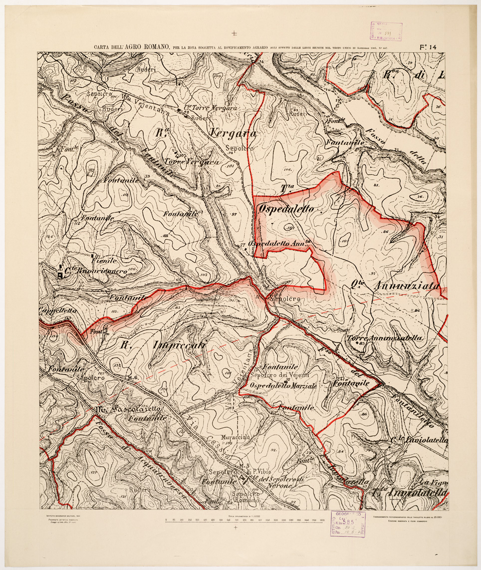 "...NEL RAPPORTO DI 1:8.000 PER LA ZONA SOGGETTA AL BONIFICAMENTO AGRARIO AGLI EFFETTI DELLE LEGGI RIUNITE IN TESTO UNICO CON R. D. NOVEMBRE 1905 N° 647. I.G.M., 1904. Ingrandimento fotozincografico in 77 fogli delle tavolette rilievo al 25.000. Stampa a colori in azzurro per le acque, verde per i limiti dell'agro romano, rosso per quelli della zona soggetta alla bonifica agraria, viola per il territorio suburbano di Roma, rosso per le tenute e le loro divisioni interne azzurro per le linee di spartiacque resto della planimetria in nero. Orografia a curve tracciate alla equidistanza di 5 metri. Annesso un quadro d'unione con elenco delle tenute private."