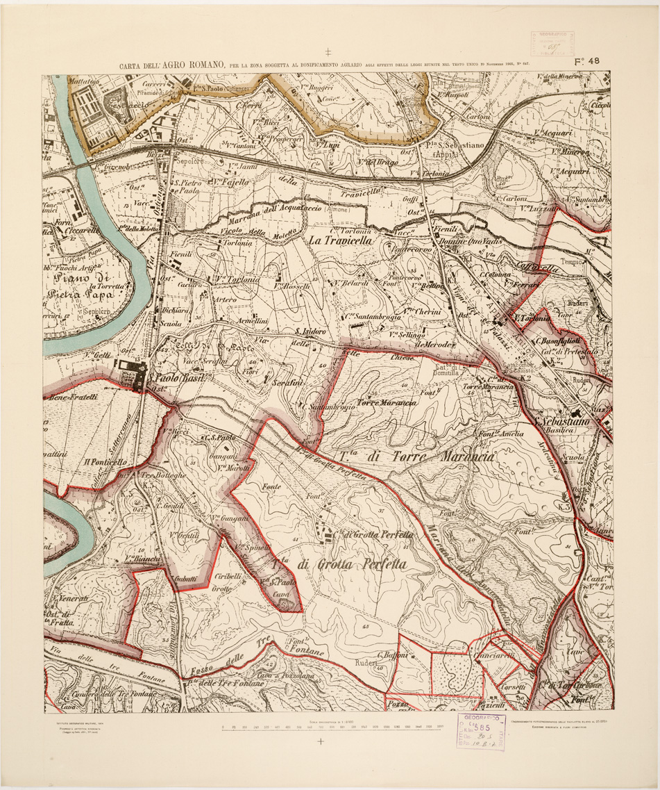 "...NEL RAPPORTO DI 1:8.000 PER LA ZONA SOGGETTA AL BONIFICAMENTO AGRARIO AGLI EFFETTI DELLE LEGGI RIUNITE IN TESTO UNICO CON R. D. NOVEMBRE 1905 N° 647. I.G.M., 1904. Ingrandimento fotozincografico in 77 fogli delle tavolette rilievo al 25.000. Stampa a colori in azzurro per le acque, verde per i limiti dell'agro romano, rosso per quelli della zona soggetta alla bonifica agraria, viola per il territorio suburbano di Roma, rosso per le tenute e le loro divisioni interne azzurro per le linee di spartiacque resto della planimetria in nero. Orografia a curve tracciate alla equidistanza di 5 metri. Annesso un quadro d'unione con elenco delle tenute private."