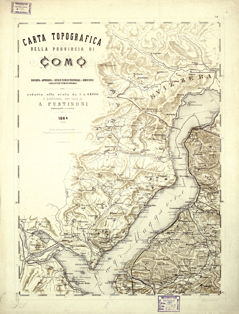 "Riveduta ed approvata dall'Ufficio Tecnico Provinciale dal Genio Civile e dall'Ufficio Tecnico Comunale ridotta alla scala da 1:64.800 e pubblicata per cura di A. Fustinoni litografo in Como."