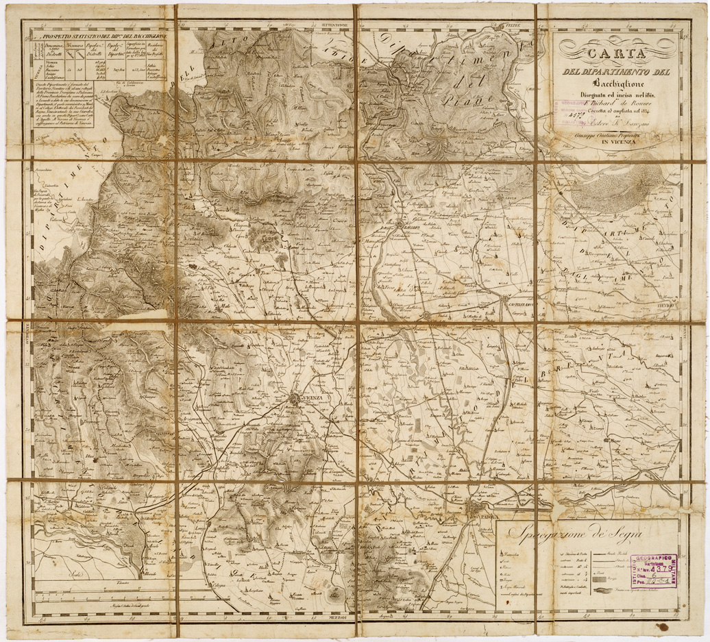 "...DISEGNATA ED INCISA NEL 1812 DA F. RICHARD DE ROUVRE CORRETTA ED AMPLIATA NEL 1834 DA ESTORE K. LANZANI. GIUSEPPE GIULIANI PROPRETARIO IN VICENZA. Foglio unico montato su tela a stacchi. Rappresentazione orografica a tratteggio. In basso: a destra, laspiegazione dei segni a sinistra due scale grafiche, in kilometri ed in miglia d'Italia di 60 al grado. In alto a sinistra recasi il prespetto statistico del dipartimento del Bacchiglione. Carta analoga a quella al numero d'ordine 65 collezione Bianconi n. 139."