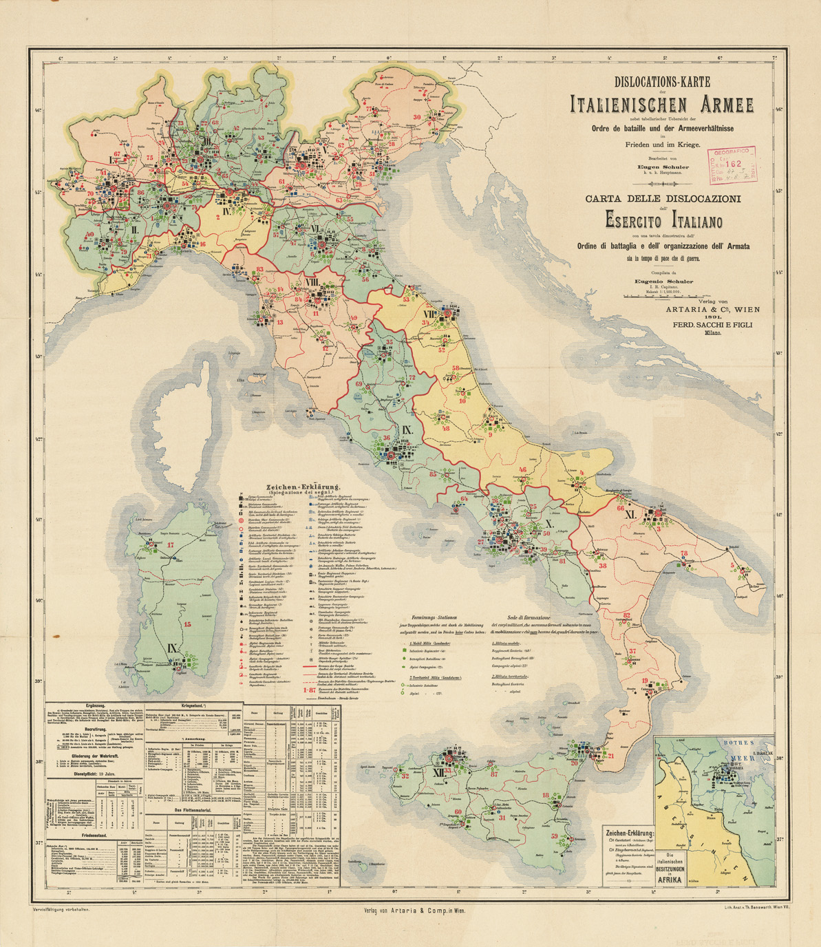 CARTA DELLE DISLOCAZIONI DELL'ESERCITO ITALIANO CON UNA TAVOLA DIMOSTRATIVA DELL'ORDINE DI BATTAGLIA E DELL'ORGANIZZAZIONE DELL'ARMATA SIA IN TEMPO DI PACE CHE DI GUERRA