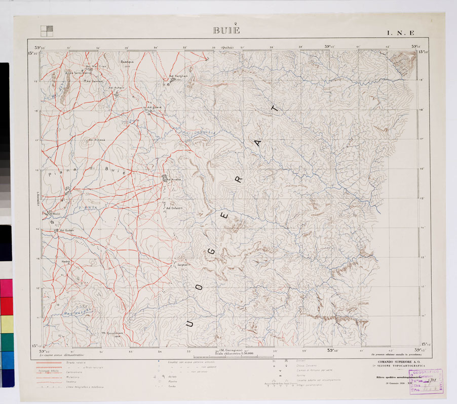 "Rilievo speditivo aereofotogrammetrico. Le curve sono dimostrative. In basso sono presenti i segni convenzionali. Comando Superiore A.O. 7^ Sezione Topocartografica."