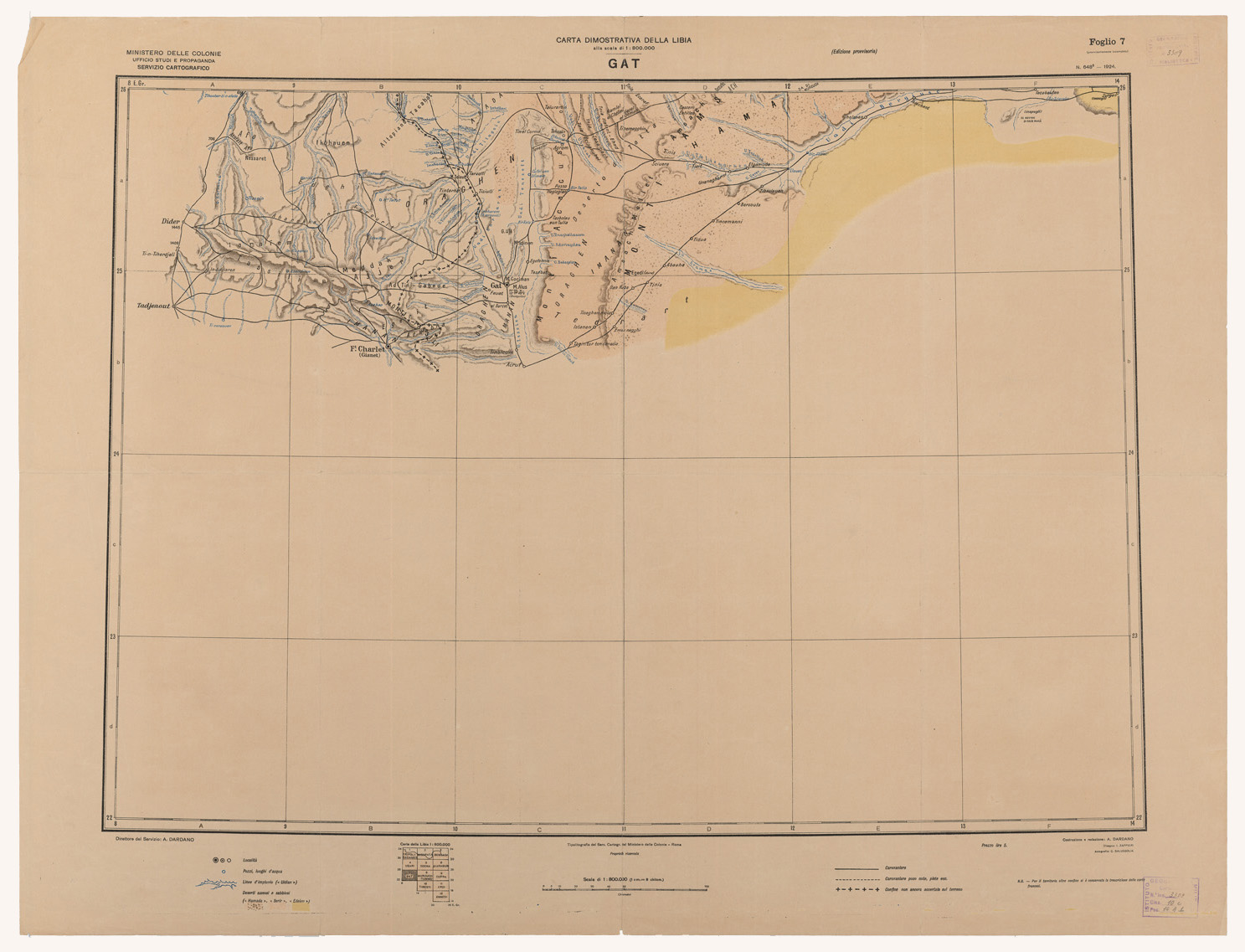 "Ministero delle Colonie. Ufficio Studi e Propaganda. Servizio Cartografico. Grande carta in 12 fogli in corso di pubblicazione. Ultimata, la carta si estenderà fino al Tibesti, Erdi, Ennedi. Sono pubblicati i fogli Tripoli, Gadames, Misurata, Ubari, Socna, Gat. La stampa è a colori con l'impiego di fondo giallino per i deserti (sassosi o sabbiosi), ombreggiature in bistro per l'orografia, azzurro per l'idrografia, nero per le scritture, abitati, ferrovie, strade, confini. I fogli contendono ognuno 4° di latitudine per 6° di longitudine."