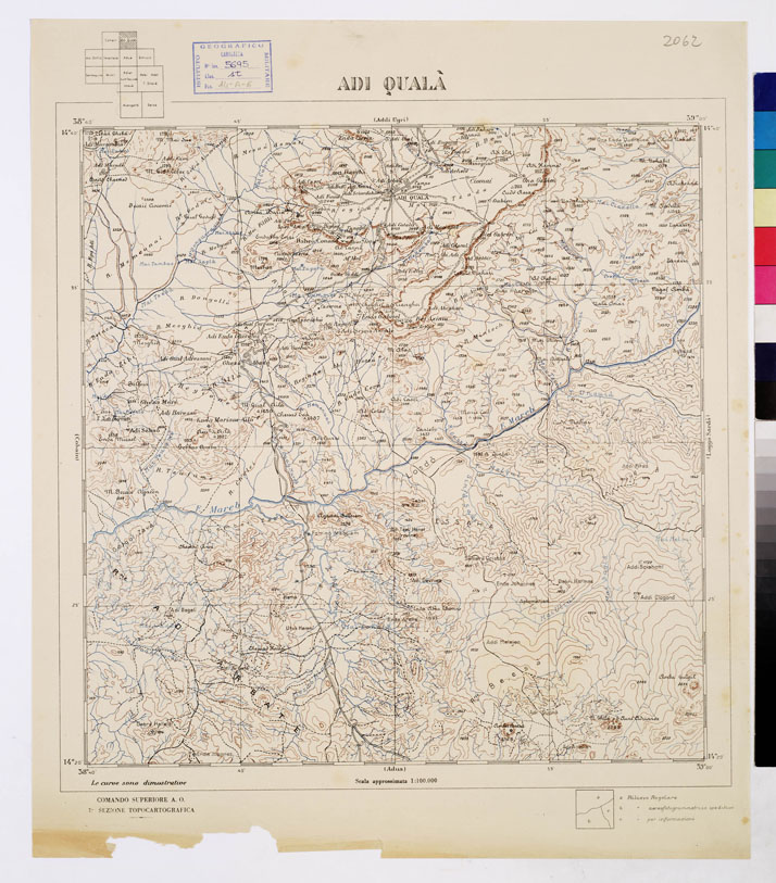 "Rappresentazione orografica a curve dimostrative. Rilievo speditivo aereofotogrammetrico, regolare e per informazioni. Comando Superiore A. O. 7^ Sezione Topocartografica."