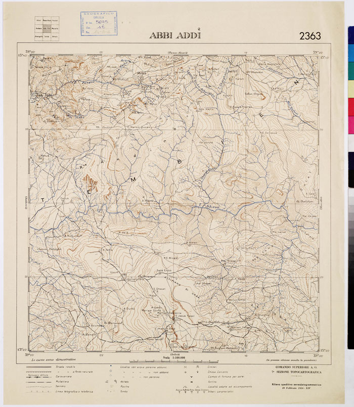 "Rappresentazione orografica a curve dimostrative. Rilievo speditivo aereofotogrammetrico. In basso vi sono i segni convenzionali. Comando Superiore A. O. 7^ Sezione Topocartografica."