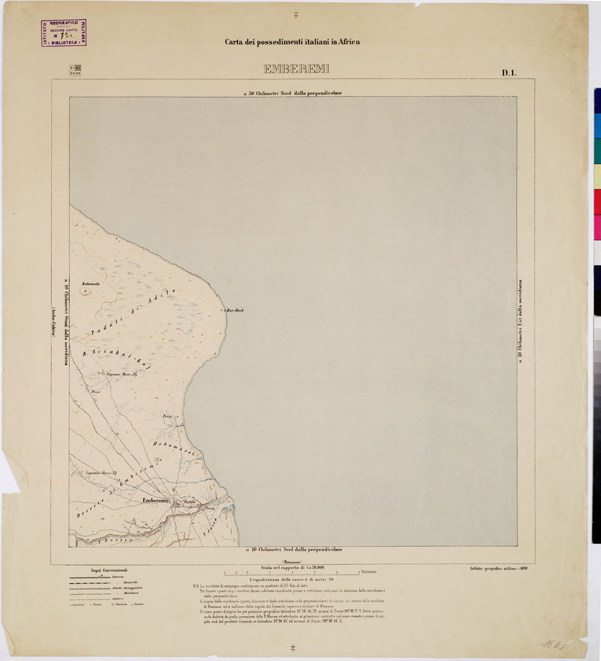 "I.G.M. Riproduzione fotozincografica delle levate originali eseguite alla medesima scala tra gli anni 1885 e 1891. Questa carta comprende la parte centrale della Colonia tra Zula, Emberèmi, Giangheren e Himberti. La proiezione adottata fu quella del Cassini con centro di sviluppo la Cupola del Palazzo del Comando a Massaua la cui posizione geografica era stata determinata astronomicamente fin dal 1885 dalla R. Marina. La carta è in 26 fogli di m. 0,40 di lato, corrispondente quindi a 20 km. sul terreno. La pubblicazione fu iniziata nel 1890 in edizione policroma (nero per la nomenclatura, le strade, le dune di sabbia azzurro per l'idrografia bistro per il terreno rosso per le quote trigonometriche) per i primi fogli e fu poi continuata in nero. In seguito la carta fu stampata interamente in nero. Nel 1909 fu allestita una nuova edizione in nero a curve di livello con equidistanza di 50 m. e numerose quote trigonometriche e topografiche. Fa eccezione il foglio Sciotel (rilevato dal Cap. Severi nel 1894) senza curve, con orografia a tratteggio. Nell'ultima edizione figurano in ciascun foglio i nomi dei mappatori e le date levate."