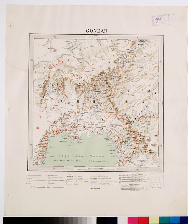 "I.G.M. Carta generale di carattere puramente descrittivo allestita dall'I.G.M. a fine di comprendervi quelle parti di territorio che con i lavori di rilievo regolari, iniziati in Colonia nel 1888, erano rimasti esclusi, e di utilizzare tutti i materiali nuovi che, con le ricognizioni, gli itinerari, gli schizzi, parziali dovuti a ufficiali e funzionari della Colonia, viaggiatori e studiosi, potevano essere ormai impiegati. La pubblicazione della carta fu iniziata nel 1897 e veniva ultimata nel 1902. La carta consta di 30 fogli di 1° di longitudine per 1° di latitudine e comprende il territorio limitato fra il 12° ed il 16° parallelo e fra il 36° meridiano ed il mare. Dei primi fogli fu anche seguita un'edizione al 250.000 in riproduzione degli originali disegnati, ma la pubblicazione non fu poi continuata. Servirono di base per la compilazione della carta le triangolazioni eseguite dall'I.G.M., le determinazioni astronomico-geodetiche dell'Ufficio Idrografico della R. Marina, del geografo D'Abbadie e quelle effettuate durante la spedizione inglese nel 1868. La proiezione impiegata fu la policentrica, sostituita fin dal 1896 a quella del Cassini anteriormente usata per i lavori topografici nella Colonia. Le longitudini furono riferite al meridiano di Greenwich. Per la parte topografica vennero ridotti i rilievi regolari alla scala di 1:50.000 e 1:100.000 dell'I.G.M. oltre le altre fonti sopra menzionate. In relazione alla disponibilità dei documenti utilizzabili, il dettaglio non appare rappresentato con la stessa uniformità nei singoli fogli. Ogni foglio porta nell'angolo inferiore l'indicazione dei documenti sui quali è fondato. La carta è stampata in litografia a colori con orografia a tratteggio in bistro, idrografia in azzurro, rete stradale e itinerari in rosso, vegetazioni in verde, ferrovie e gli altri particolari in nero. Si è impiegata la scrittura in rosso per i nomi delle divisioni politiche e regionali e in nero per i nomi etnografici. I nomi tutti sono scritti con grafia italiana. I fogli furono disegnati alla scala di 1:200.000 e ridotti con la fotozincografia al 400.000. Utilizzando gli elementi della "Carta dimostrativa della Colonia Eritrea" al 500.000 (ved. N° 50 d'ordine, N. 694 d'inventario generale) e altri raccolti per nuove zone della regione, fu allestita una nuova edizione della carta corretta e accresciuta. Essa fu estesa al 18° parallelo per includervi Ras Casar (18° 2') e a sud fino all'11° parallelo per la parte che trovasi ad oriente del 40° meridiano comprendendo così tutta la regione estrema meridionale dell'Aussa e il territorio adiacente alla Baia di Tagiura. La nuova edizione fu pubblicata in 12 fogli interi di 2° di long. per 2° di lat. e due mezzi fogli per la parte meridionale. Fu ultimata nel 1909. Tenuta al corrente per qualche tempo, passò fra le carte di mobilitazione nel 1927."
