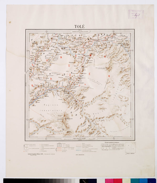 "I.G.M. Carta generale di carattere puramente descrittivo allestita dall'I.G.M. a fine di comprendervi quelle parti di territorio che con i lavori di rilievo regolari, iniziati in Colonia nel 1888, erano rimasti esclusi, e di utilizzare tutti i materiali nuovi che, con le ricognizioni, gli itinerari, gli schizzi, parziali dovuti a ufficiali e funzionari della Colonia, viaggiatori e studiosi, potevano essere ormai impiegati. La pubblicazione della carta fu iniziata nel 1897 e veniva ultimata nel 1902. La carta consta di 30 fogli di 1° di longitudine per 1° di latitudine e comprende il territorio limitato fra il 12° ed il 16° parallelo e fra il 36° meridiano ed il mare. Dei primi fogli fu anche seguita un'edizione al 250.000 in riproduzione degli originali disegnati, ma la pubblicazione non fu poi continuata. Servirono di base per la compilazione della carta le triangolazioni eseguite dall'I.G.M., le determinazioni astronomico-geodetiche dell'Ufficio Idrografico della R. Marina, del geografo D'Abbadie e quelle effettuate durante la spedizione inglese nel 1868. La proiezione impiegata fu la policentrica, sostituita fin dal 1896 a quella del Cassini anteriormente usata per i lavori topografici nella Colonia. Le longitudini furono riferite al meridiano di Greenwich. Per la parte topografica vennero ridotti i rilievi regolari alla scala di 1:50.000 e 1:100.000 dell'I.G.M. oltre le altre fonti sopra menzionate. In relazione alla disponibilità dei documenti utilizzabili, il dettaglio non appare rappresentato con la stessa uniformità nei singoli fogli. Ogni foglio porta nell'angolo inferiore l'indicazione dei documenti sui quali è fondato. La carta è stampata in litografia a colori con orografia a tratteggio in bistro, idrografia in azzurro, rete stradale e itinerari in rosso, vegetazioni in verde, ferrovie e gli altri particolari in nero. Si è impiegata la scrittura in rosso per i nomi delle divisioni politiche e regionali e in nero per i nomi etnografici. I nomi tutti sono scritti con grafia italiana. I fogli furono disegnati alla scala di 1:200.000 e ridotti con la fotozincografia al 400.000. Utilizzando gli elementi della "Carta dimostrativa della Colonia Eritrea" al 500.000 (ved. N° 50 d'ordine, N. 694 d'inventario generale) e altri raccolti per nuove zone della regione, fu allestita una nuova edizione della carta corretta e accresciuta. Essa fu estesa al 18° parallelo per includervi Ras Casar (18° 2') e a sud fino all'11° parallelo per la parte che trovasi ad oriente del 40° meridiano comprendendo così tutta la regione estrema meridionale dell'Aussa e il territorio adiacente alla Baia di Tagiura. La nuova edizione fu pubblicata in 12 fogli interi di 2° di long. per 2° di lat. e due mezzi fogli per la parte meridionale. Fu ultimata nel 1909. Tenuta al corrente per qualche tempo, passò fra le carte di mobilitazione nel 1927."