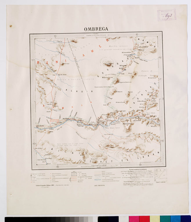 "I.G.M. Carta generale di carattere puramente descrittivo allestita dall'I.G.M. a fine di comprendervi quelle parti di territorio che con i lavori di rilievo regolari, iniziati in Colonia nel 1888, erano rimasti esclusi, e di utilizzare tutti i materiali nuovi che, con le ricognizioni, gli itinerari, gli schizzi, parziali dovuti a ufficiali e funzionari della Colonia, viaggiatori e studiosi, potevano essere ormai impiegati. La pubblicazione della carta fu iniziata nel 1897 e veniva ultimata nel 1902. La carta consta di 30 fogli di 1° di longitudine per 1° di latitudine e comprende il territorio limitato fra il 12° ed il 16° parallelo e fra il 36° meridiano ed il mare. Dei primi fogli fu anche seguita un'edizione al 250.000 in riproduzione degli originali disegnati, ma la pubblicazione non fu poi continuata. Servirono di base per la compilazione della carta le triangolazioni eseguite dall'I.G.M., le determinazioni astronomico-geodetiche dell'Ufficio Idrografico della R. Marina, del geografo D'Abbadie e quelle effettuate durante la spedizione inglese nel 1868. La proiezione impiegata fu la policentrica, sostituita fin dal 1896 a quella del Cassini anteriormente usata per i lavori topografici nella Colonia. Le longitudini furono riferite al meridiano di Greenwich. Per la parte topografica vennero ridotti i rilievi regolari alla scala di 1:50.000 e 1:100.000 dell'I.G.M. oltre le altre fonti sopra menzionate. In relazione alla disponibilità dei documenti utilizzabili, il dettaglio non appare rappresentato con la stessa uniformità nei singoli fogli. Ogni foglio porta nell'angolo inferiore l'indicazione dei documenti sui quali è fondato. La carta è stampata in litografia a colori con orografia a tratteggio in bistro, idrografia in azzurro, rete stradale e itinerari in rosso, vegetazioni in verde, ferrovie e gli altri particolari in nero. Si è impiegata la scrittura in rosso per i nomi delle divisioni politiche e regionali e in nero per i nomi etnografici. I nomi tutti sono scritti con grafia italiana. I fogli furono disegnati alla scala di 1:200.000 e ridotti con la fotozincografia al 400.000. Utilizzando gli elementi della "Carta dimostrativa della Colonia Eritrea" al 500.000 (ved. N° 50 d'ordine, N. 694 d'inventario generale) e altri raccolti per nuove zone della regione, fu allestita una nuova edizione della carta corretta e accresciuta. Essa fu estesa al 18° parallelo per includervi Ras Casar (18° 2') e a sud fino all'11° parallelo per la parte che trovasi ad oriente del 40° meridiano comprendendo così tutta la regione estrema meridionale dell'Aussa e il territorio adiacente alla Baia di Tagiura. La nuova edizione fu pubblicata in 12 fogli interi di 2° di long. per 2° di lat. e due mezzi fogli per la parte meridionale. Fu ultimata nel 1909. Tenuta al corrente per qualche tempo, passò fra le carte di mobilitazione nel 1927."