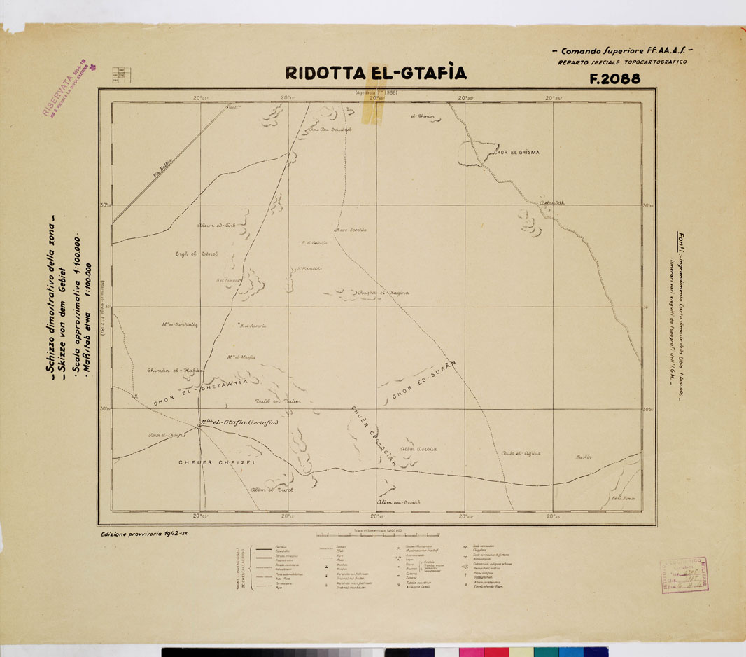 "COMANDO SUPERIORE F.F.A.A. REPARTO SPECIALE TOPOCARTOGRAFICO. Ingrandimento Carta dimostrativa della Libia 1:400.000 rilevamento della costa eseguito dall R. Marina tracciato della Via Balbia dell'Ufficio Spec.le della Strada. Itinerari vari eseguiti da topografi dell'I.G.M. determinazioni astronomiche speditive e triangolazioni trigonometriche dell'I.G.M. e della R. Marina. Informazioni varie."