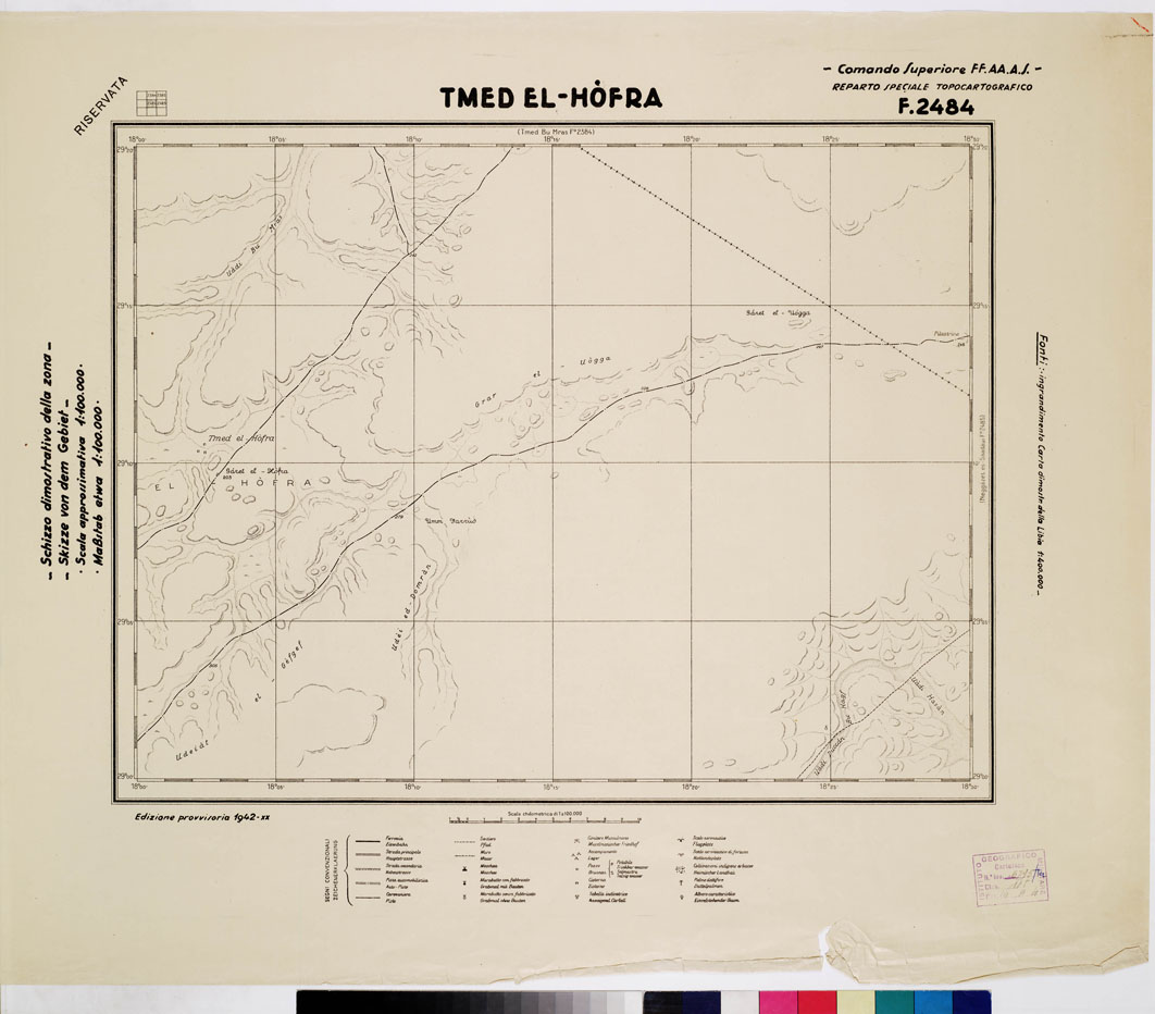 "COMANDO SUPERIORE F.F.A.A. REPARTO SPECIALE TOPOCARTOGRAFICO. Ingrandimento Carta dimostrativa della Libia 1:400.000 rilevamento della costa eseguito dalla R. Marina tracciato della Via Balbia dell'Ufficio Spec.le della Strada. Itinerari vari eseguiti da topografi dell'I.G.M. determinazioni astronomiche speditive e triangolazioni trigonometriche dell'I.G.M. e della R. Marina. Informazioni varie."