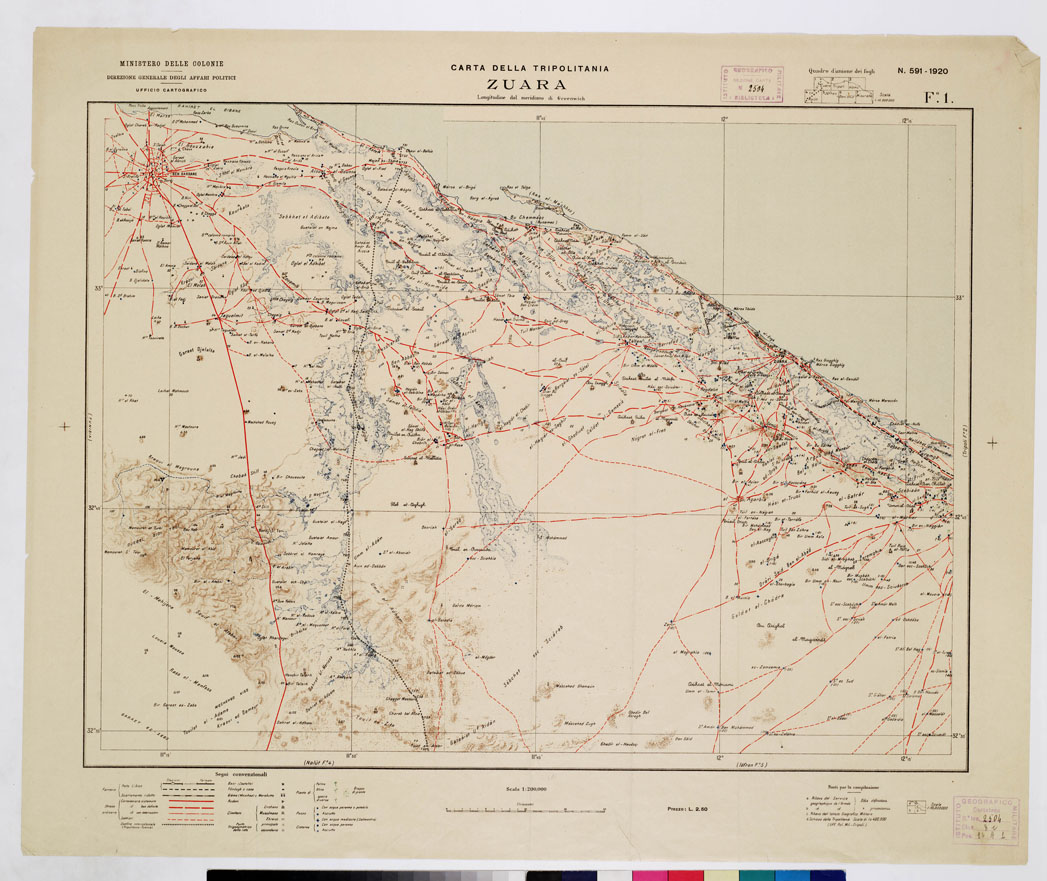 "Ministero delle Colonie. Direzione Generale degli Affari Politici. Ufficio Cartografico. Tre dei fogli della carta dimostrativa che ultimata comprenderà anche i fogli Nalùt, Jèfren, Beni Ulid, Misurata. La stampa è policroma con ferrovie, confini, centri abitati, case, moschee in nero, piante isolate o gruppi di piante in verde, pozzi e cisterne in azzurro, carovaniere, sentieri in rosso. Ogni foglio porta indicate le fonti usate per la compilazione. Vi è anche inserito un quadro d'unione alla scala di 1:10.000.000. I tre fogli comprendono la zona costiera da Ben Bardane (Tunisia) a Zliten e nell' interno fino oltre il 32° 30' lat. nord. Le longitudini sono riferite al meridiano di Greenwich. "