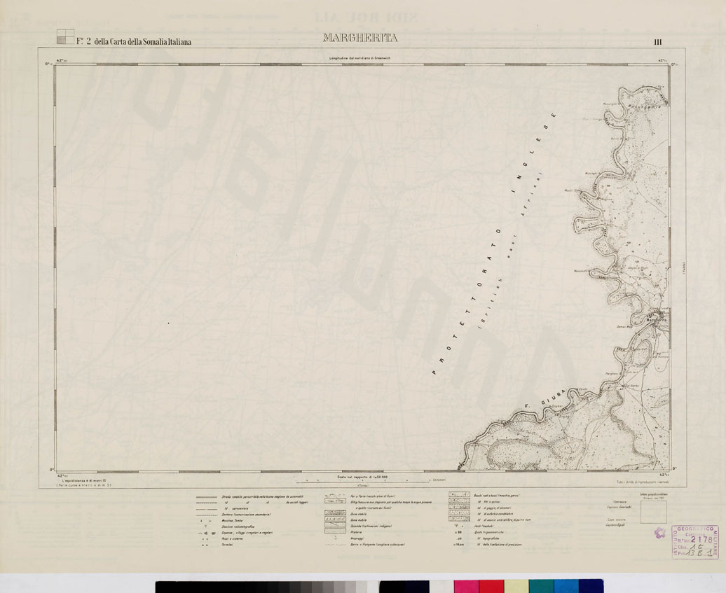 "(Fogli N. 1, 2, 4 della Carta della Somalia Italiana). I.G.M. Questa carta, insieme a quelle della regione di Brava-Soblalle-Avai, al 100 000 (ved. N°11 d'ordine) e della regione dell'Uebi-Scebeli presso Merca, al 1:50000 (v. N°10 d'ordine), rappresenta uno dei rilievi di precisione pubblicati dall'I.G.M. per la Somalia. I lavori topografici regolari furono iniziati nel 1910. Scartata la prima idea di adottare la scala di 1:100000 (perché la carta male avrebbe corrisposto agli scopi per i quali era costruita, volendosi con essa ottenere una guida per le delimitazioni delle concessioni, progetti stradali e di canalizzazione, ecc.), venne scelta la scala di 1:50000 e fu inoltre stabilito di eseguire le livellazioni geometriche. La proiezione impiegata fu la cilindrica equivalente di Lambert. Le levate topografiche, estese in un primo tempo a una superficie di circa 1000 kmq e suddivise in 5 tavolette di 10' di latitudine per 15' di longitudine, denominate rispettivamente Giumbo, Torda, Muriole, Margherita, e Vadda, furono continuate poi nel 1912 e 1913 nella zona settentrionale. Furono comprese così altre 4 tavolette denominate Cainsuma, Gelib sul Giuba, Aughele, Arenaga, sicché l'intera carta copre circa 1900 kmq rappresentati in 9 fogli. La stampa era a colori ma nel 1998 venne restaurata in nero. Le curve altimetriche sono tracciate all'equidistanza di 10 metri. Sono distinte le dune stabili, le dune mobili, le coltivazioni indigene (sciambe), le praterie e i diversi tipi di vegetazione. Per la viabilità si sono impiegati due segni, uno per le carovaniere l'altro per i sentieri. I nomi di luogo sono trascritti secondo la grafia italiana. La carta, pur limitata a una non vasta zona, costituisce un notevole contributo alla cartografia della Somalia."
