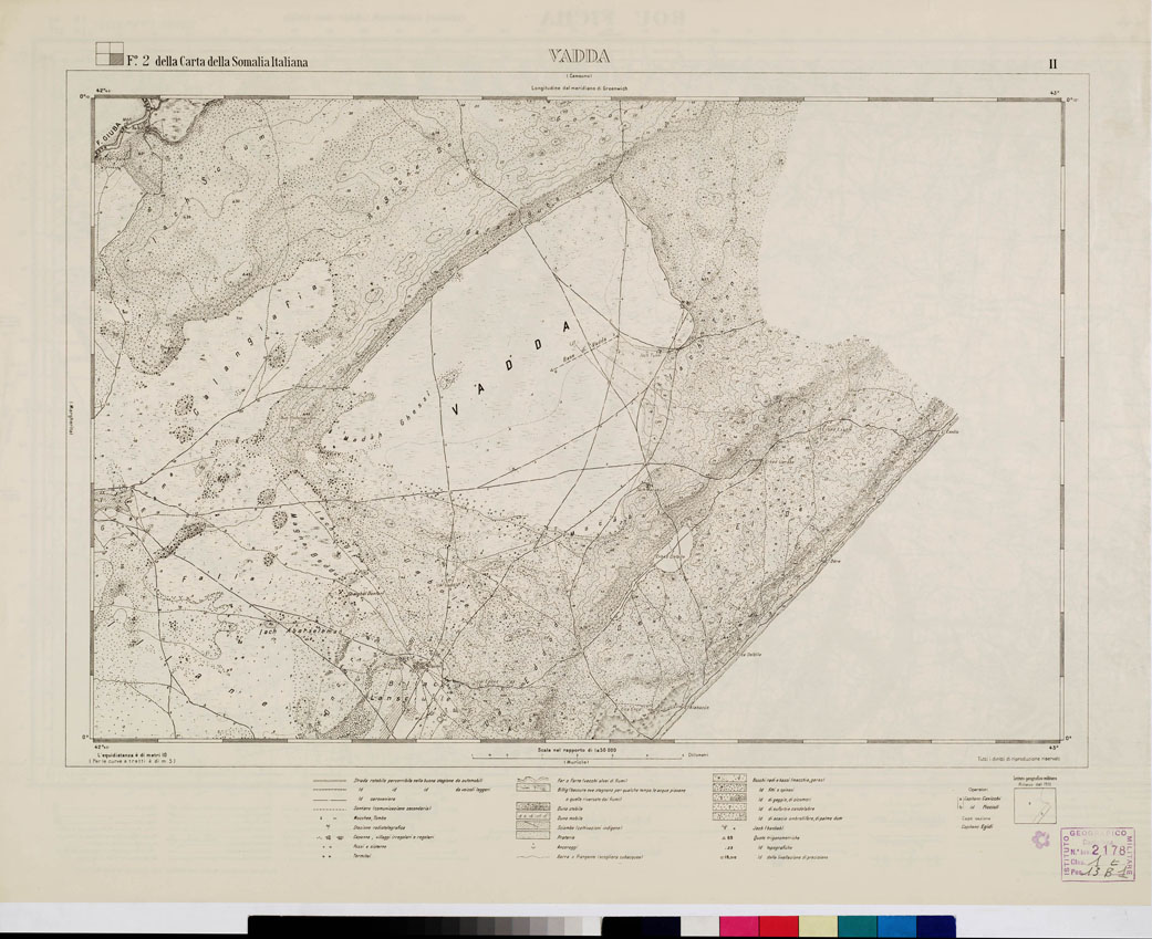 "(Fogli N. 1, 2, 4 della Carta della Somalia Italiana). I.G.M. Questa carta, insieme a quelle della regione di Brava-Soblalle-Avai, al 100 000 (ved. N°11 d'ordine) e della regione dell'Uebi-Scebeli presso Merca, al 1:50000 (v. N°10 d'ordine), rappresenta uno dei rilievi di precisione pubblicati dall'I.G.M. per la Somalia. I lavori topografici regolari furono iniziati nel 1910. Scartata la prima idea di adottare la scala di 1:100000 (perché la carta male avrebbe corrisposto agli scopi per i quali era costruita, volendosi con essa ottenere una guida per le delimitazioni delle concessioni, progetti stradali e di canalizzazione, ecc.), venne scelta la scala di 1:50000 e fu inoltre stabilito di eseguire le livellazioni geometriche. La proiezione impiegata fu la cilindrica equivalente di Lambert. Le levate topografiche, estese in un primo tempo a una superficie di circa 1000 kmq e suddivise in 5 tavolette di 10' di latitudine per 15' di longitudine, denominate rispettivamente Giumbo, Torda, Muriole, Margherita, e Vadda, furono continuate poi nel 1912 e 1913 nella zona settentrionale. Furono comprese così altre 4 tavolette denominate Cainsuma, Gelib sul Giuba, Aughele, Arenaga, sicché l'intera carta copre circa 1900 kmq rappresentati in 9 fogli. La stampa era a colori ma nel 1998 venne restaurata in nero. Le curve altimetriche sono tracciate all'equidistanza di 10 metri. Sono distinte le dune stabili, le dune mobili, le coltivazioni indigene (sciambe), le praterie e i diversi tipi di vegetazione. Per la viabilità si sono impiegati due segni, uno per le carovaniere l'altro per i sentieri. I nomi di luogo sono trascritti secondo la grafia italiana. La carta, pur limitata a una non vasta zona, costituisce un notevole contributo alla cartografia della Somalia."
