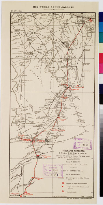 "Autore Ministero della Colonie. Itinerario percorso dalla colonna Miani. Riduzione dello schizzo a firma del T. C. Miani pubblicato dal governo della Tripolitania. Direzione Affari Politici - Ufficio cartografico. Litografo C. Salussolia. Cartina compilata da M. Checchi. Mostra le vie di comunicazione in nero, e l'itinerario Miani in rosso con indicazione dei luoghi di sosta della colonna, luoghi riconosciuti da colonne distaccate, luoghi di combattimento."