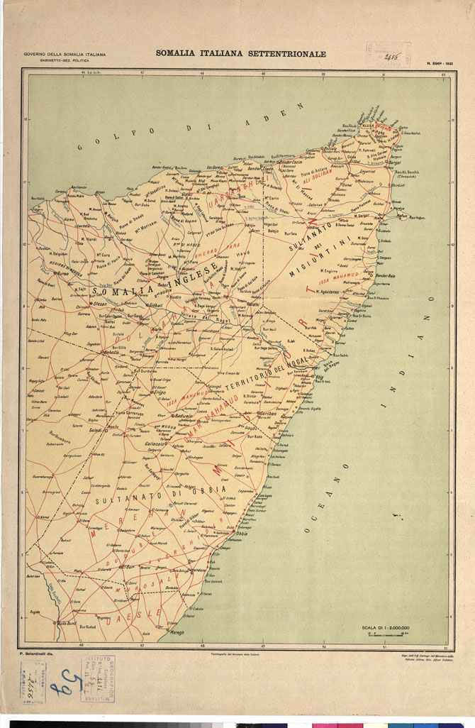 "Governo della Somalia Italiana. Gabinetto Sez. Politica. Riprod. dell' Ufficio Cart. del Ministero delle Colonie (Dir. Gen. Affari Politici). Carta generale della Colonia in due fogli, riprodotti in tipolitografia, con terreno a fondo unito giallino, rete stradale in rosso, rete idrografica in azzurro scritture in nero per i nomi di luogo, azzurro per quelli idrografici, rosso per gli etnografici. Non è rappresentato il rilievo orografico. "