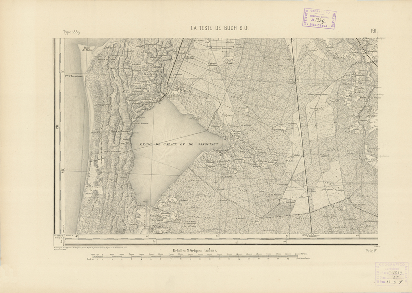 "Paris. - Service Géograèhique de l'Armée, 1889. Ebbe origine dall'Edizione zincografica in quarti di foglio, stabilita fino dal 1879, per la Carta detta de "L'etat-Major". Infatti non rispondendo più il sistema della riproduzione zincografica alle esigenze che la revisione dei fogli imponeva per un inevitabile logoramento dei rami originali, fu proposta dapprima la correzione degli zinchi, ma questo, importando un lavoro lungo e gravoso, si adottò il procedimento galvanico. I rami galvanici ottenuti e corretti secondo questo sistema presero il nome di "édition type 1889". Allo scopo di facilitare l'incisione fu adoperata la suddivisione in quarti di foglio come per l'edizione zincografica. la revisione dei fogli di questo tipo nnn fu iniziata che nel 1893. Dal catalogo del S.G.A. risultano mancanti a questa edizione i dipartimenti della "Moselle", del "Bas-Rhin" e del "Haut-Rhin" per le quali non esiste che una edizione in fogli interi aggiornata nel 1901."
