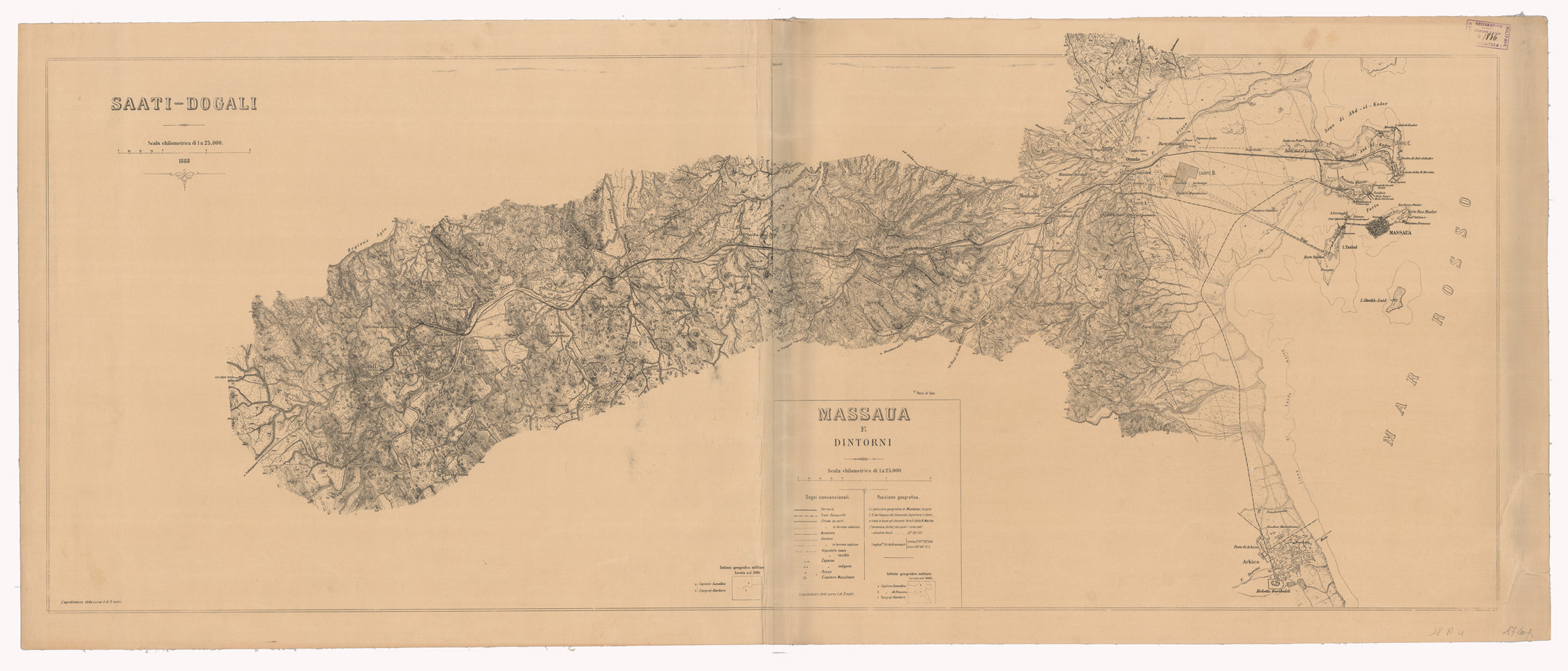 "I.G.M. La carta è in tre fogli riprodotti in fotozincografia sui rilievi eseguiti nel 1888 completati con quelli del 1885 (Ten.i Lavallea, De Fonseca, top. Ciorlieri) e appoggiati ad una triangolazione grafica. La posizione di Massaua (spigolo sud-est del Palazzo del Comando) fu determinata in base agli elementi forniti dalla R. Marina (Cannoniera "Scilla") dai quali risulta a 15° 36' 41" lat. nord, ed a 39° 28' 9" longitudine est Greenwich. La rappresentazione orografica è a curve di livello tracciate all'equidistanza di 5 m. I fogli comprendono la zona adiacente alla ferrovia Massaua Saati e il litorale fino al villaggio di Arkico. La carta è stampata in nero: fu riprodotta a colori e inserita nella "Rivista Militare Italiana" (settembre 1888) ad accompagnare la relazione ufficiale della campagna di guerra per la rioccupazione di Saati (1887-1888) in occasione della quale furono compiute le ulteriori operazioni topografiche in quella zona. Questi rilievi e quelli al 10.000 intorno a Massaua eseguiti nel 1885-1888 dal Tenente Lavallea (ved. N° 4 e 19 d'ordine, N. 4258 e 1834 d'inventario generale), furono poi impiegati nella preparazione della carta al 50.000 della Colonia Eritrea (ved. N° 61 d'ordine, N. 724 d' inventario generale)."