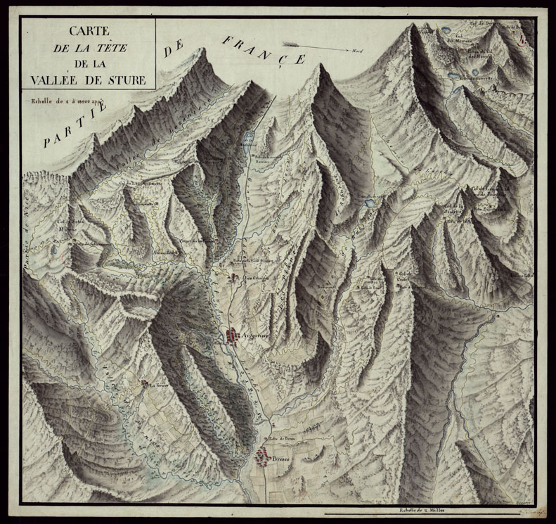 "Disegno ad acquerello firmato Roggero e Cap. Tallaro. Orografia semiprospettica a luce obliqua. Abitati in prospettiva, acque in azzurro, vegetazione in verde, strade in giallo. Il nord è spostato verso il lato destro del foglio. Toponomastica in francese."