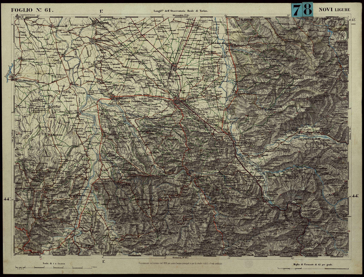 "Altro esemplare del Docum. N°77 Ordine 101 Gruppo 4 riveduta al 1875 con rete stradale a colori. Un piccolo cartello annesso reca scritto "PIEMONTE E LIGURIA al 50 000. Carta tipica stradale spedita al Comando del Corpo nel 1877" Altra edizione riveduta al corrente per le ferrovie fino al 1884."