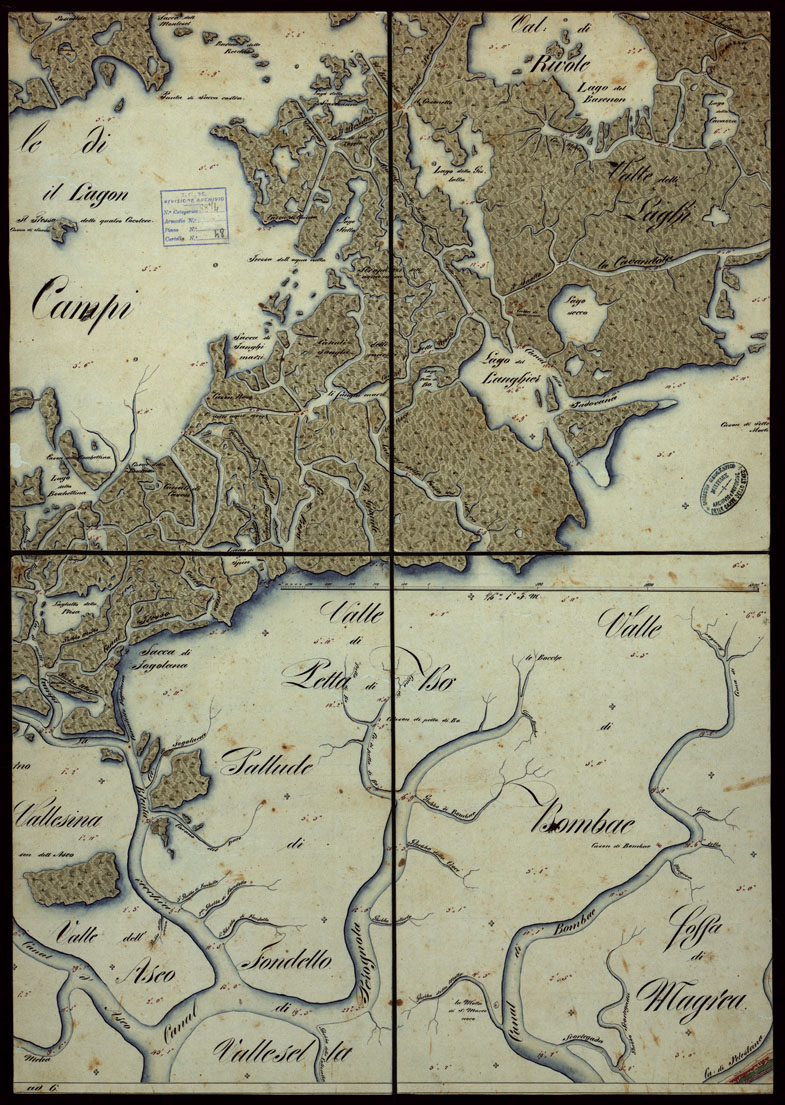 "Piano della città marittima e fortezza di Venezia colle sue lagune e colla terra ferma che le circonda, dalla foce dell'Adige a quella del Piave. Copia della carta del Denaix eseguita dal 1800 al 1808 alla scala di 1:18.000 in trenta fogli. Il disegno fu eseguito nel 1836 la riduzione nel 1837 a spesa del Genio terrestre austriaco. Consta di trenta fogli ad acquarello montati su tela. Colori usati: azzurro per l'idrografia, rosso per gli abitati e le strade principali, verde per le coltivazioni. Il foglio 1 contiene il quadro di unione. I fogli 9 e 10 recano il titolo il foglio 20 contiene notizie sulla costruzione della carta: il foglio 25 la rosa dei venti il foglio 30 notizie sulla laguna. Annessi alla carta sono un piano del Forte di S.Pietro pure ad acquarello alla scala di 1:2.500 e una carta dei "sondaggi lungo la costa tra il Forte Alberone e la Batteria Quattro Fontane" firmata "Salis Soglio maggio 1847"."