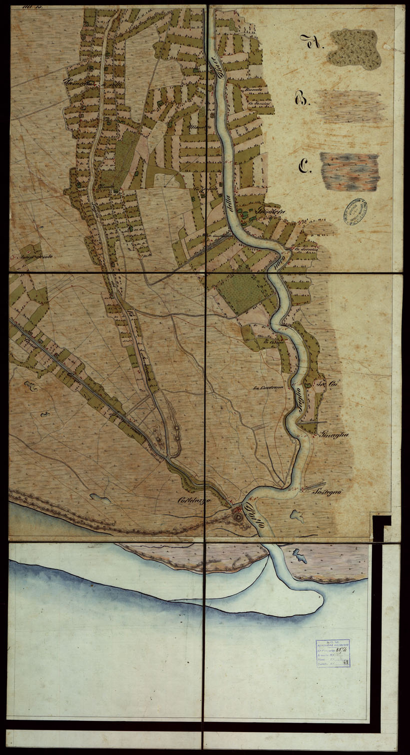 "Piano della città marittima e fortezza di Venezia colle sue lagune e colla terra ferma che le circonda, dalla foce dell'Adige a quella del Piave. Copia della carta del Denaix eseguita dal 1800 al 1808 alla scala di 1:18.000 in trenta fogli. Il disegno fu eseguito nel 1836 la riduzione nel 1837 a spesa del Genio terrestre austriaco. Consta di trenta fogli ad acquarello montati su tela. Colori usati: azzurro per l'idrografia, rosso per gli abitati e le strade principali, verde per le coltivazioni. Il foglio 1 contiene il quadro di unione. I fogli 9 e 10 recano il titolo il foglio 20 contiene notizie sulla costruzione della carta: il foglio 25 la rosa dei venti il foglio 30 notizie sulla laguna. Annessi alla carta sono un piano del Forte di S.Pietro pure ad acquarello alla scala di 1:2.500 e una carta dei "sondaggi lungo la costa tra il Forte Alberone e la Batteria Quattro Fontane" firmata "Salis Soglio maggio 1847"."