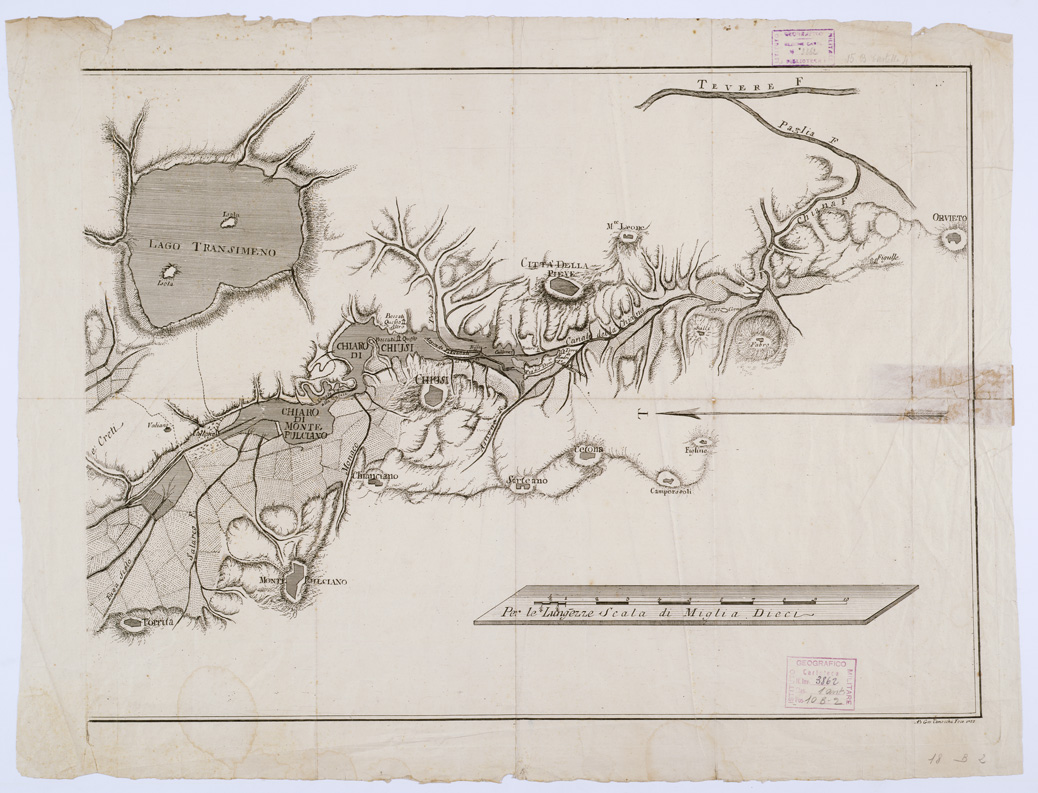 "Carta analoga a quella di cui al n. 3861 d´inventario (" Carta dei corsi superiori dei fiumi Arno e Tevere e della Chiana "). Incisione su rame di A. B. Canocchi. Rappresenta la Val di Chiana meridionale e il Lago Trasimeno. Scala grafica in miglia. Orientazione: nord a sinistra del foglio."